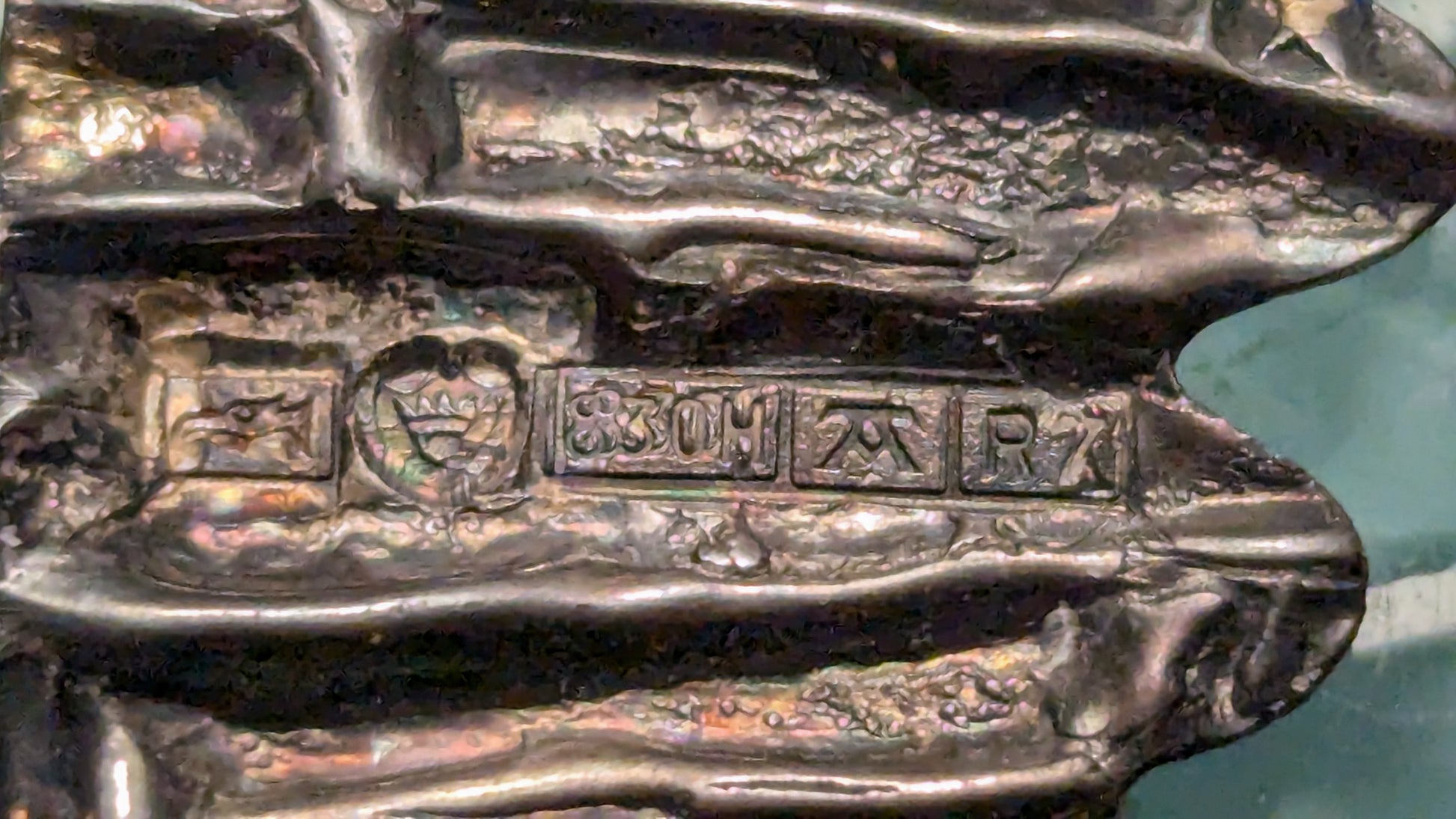 Hopeapannassa leimat joiden mukaan sen on valmistanut Auran Kultaseppä Oy, Turku, vuonna 1970. Lisäksi 830H merkintä.