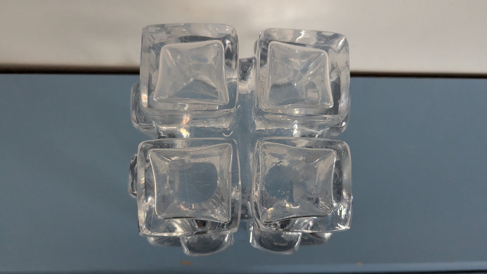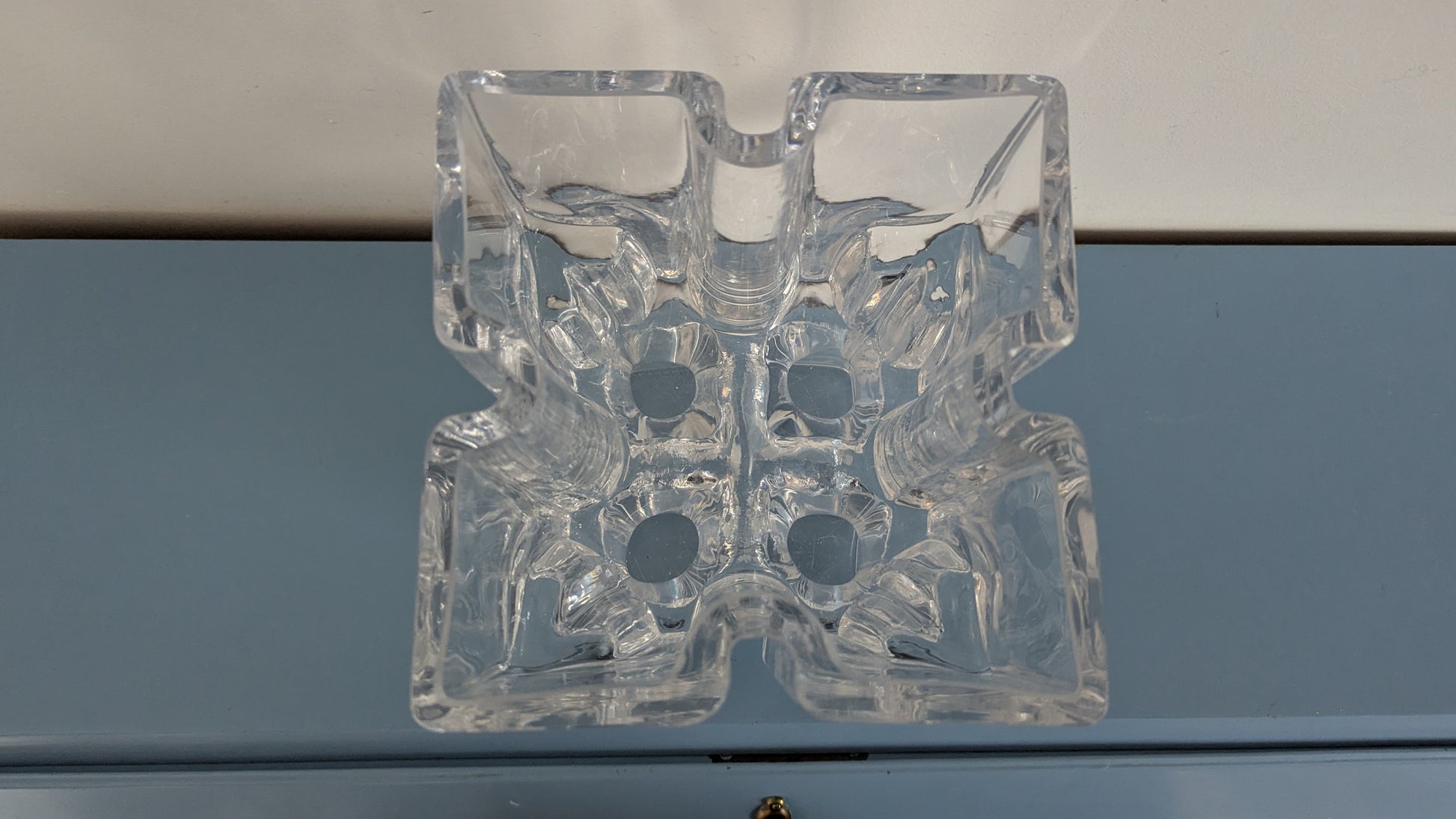 Ei halkeamia. Pohjassa runsaasti siirtelystä tullutta naarmua. Pohjassa, signeerauksen yläpuolella, yksi 2mm iskemä mikä näkyy viimeisessä kuvassa.
