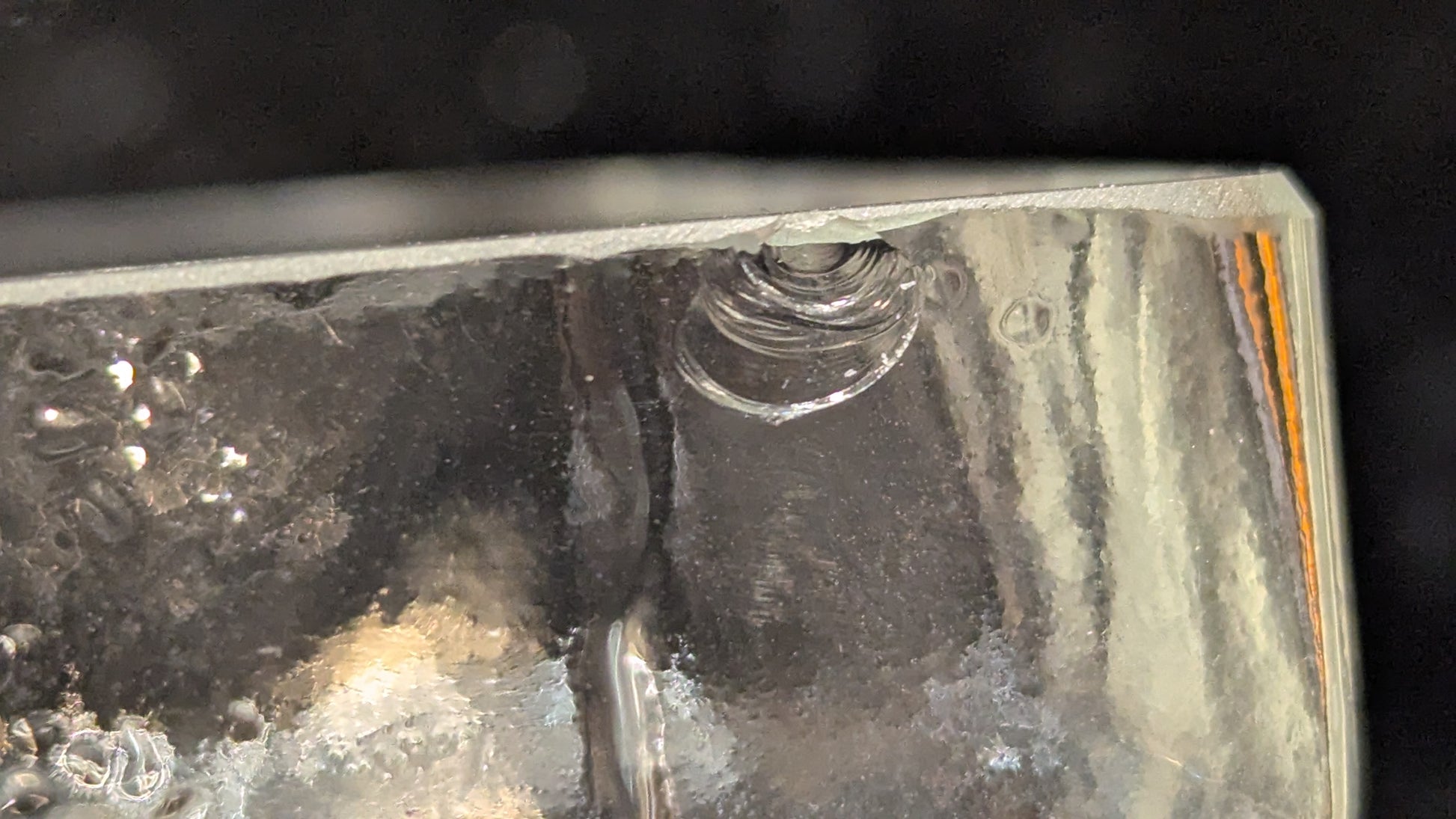 Riihimäen tarra paikalla. Tosin siitä teksti ja kuva kulunut pois. Ei halkeamia tai naarmuja mutta yhdellä sivulla 5mm iskemä, mikä näkyy viimeisessä kuvassa.