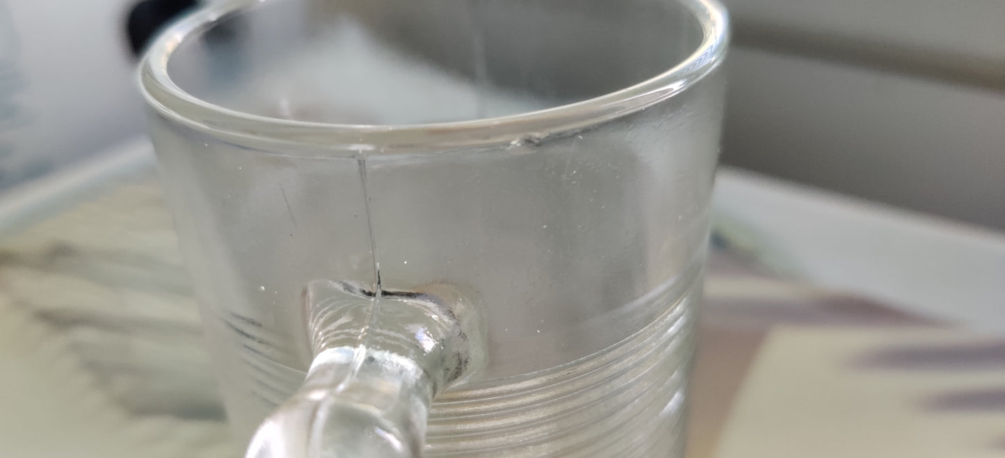 Minimaalista käyttökulumaa. Ei halkeamia. Yhdessä sangan lähellä pieni iskemä, mikä näkyy viimeisessä kuvassa. Ei haittaa juomista kun tosiaan sellaisessa paikassa että siitä kohtaa ei juoda. Muissa ei iskemiä.