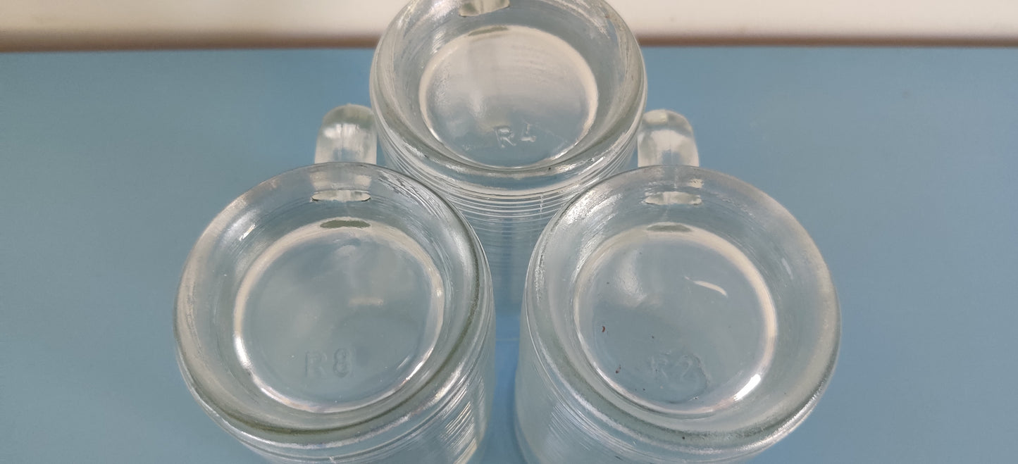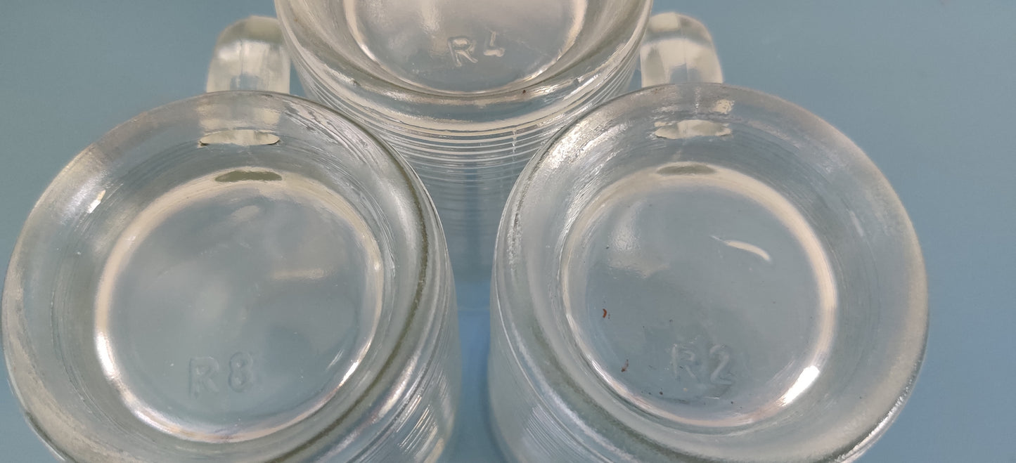 Pohjassa kohokirjaimin leimat R2, R8 ja R4 eli jokaisessa eri.