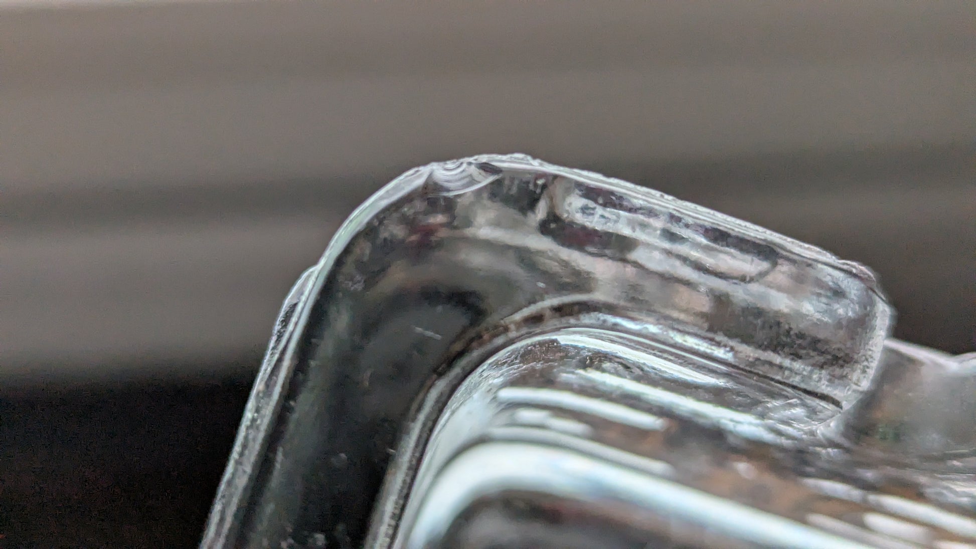 Ei halkeamia tai naarmuja. Yhdessä nurkassa 4mm iskemä, mikä näkyy viimeisessä kuvassa. Ei pomppaa silmään vaan näkyy tietystä kulmasta katsottaessa.