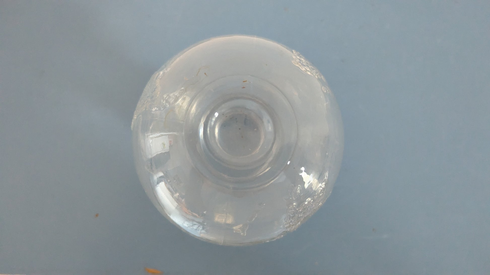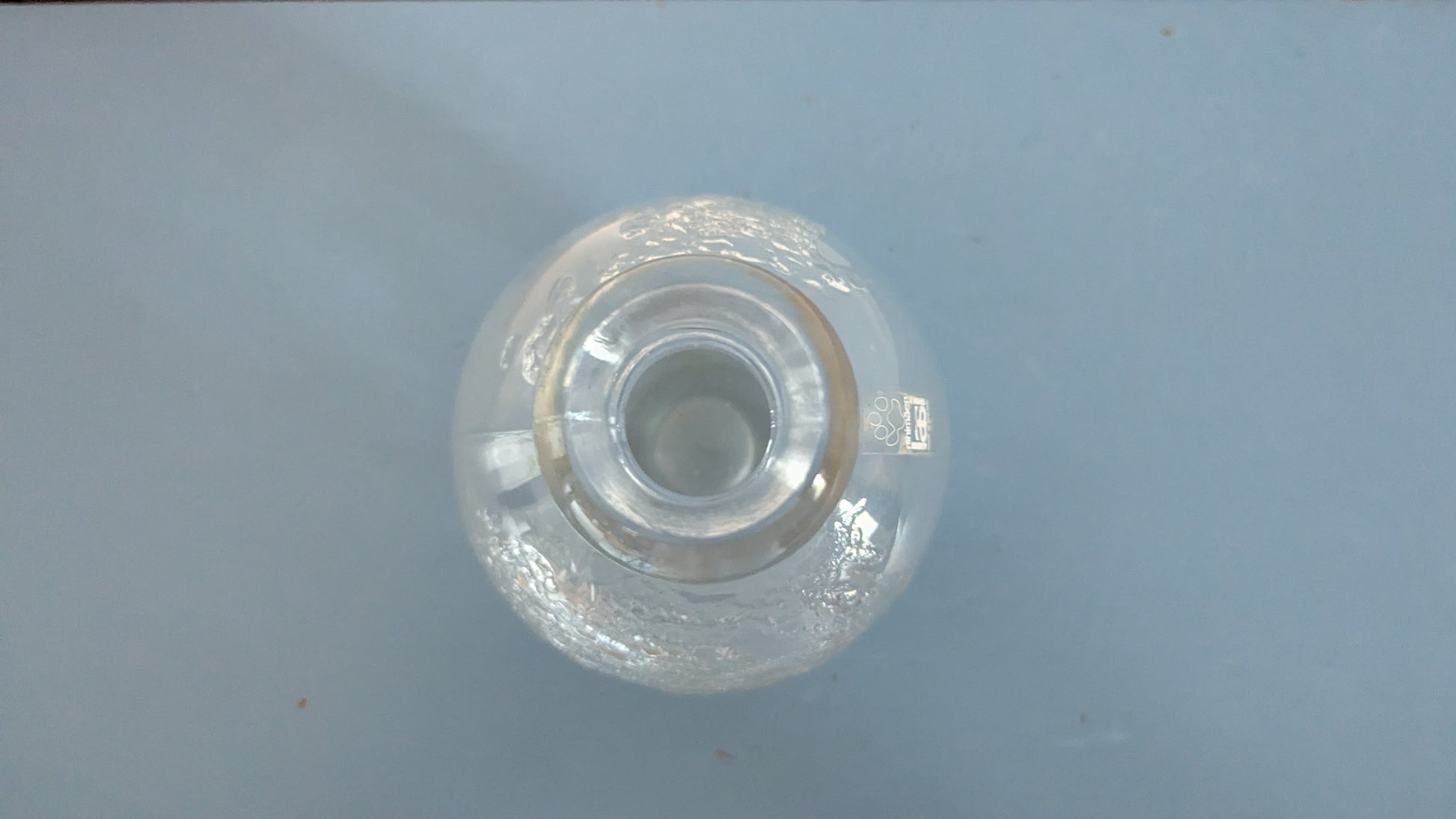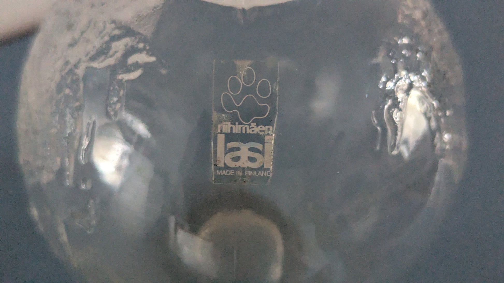 Riihimäen lasin tarra paikallaan. Ei iskemiä, halkeamia tai naarmuja. Pohjalla pientä sameutta.