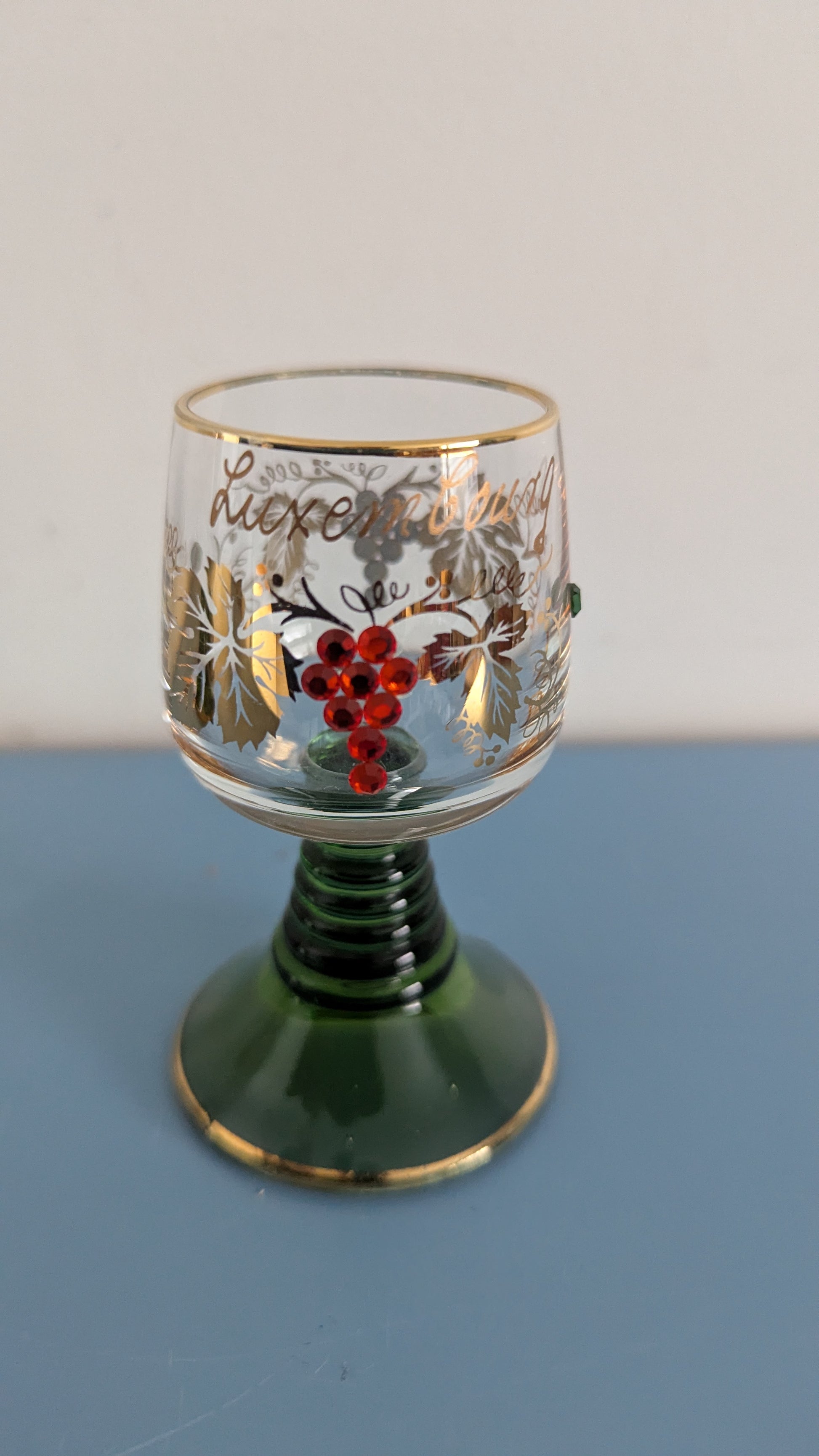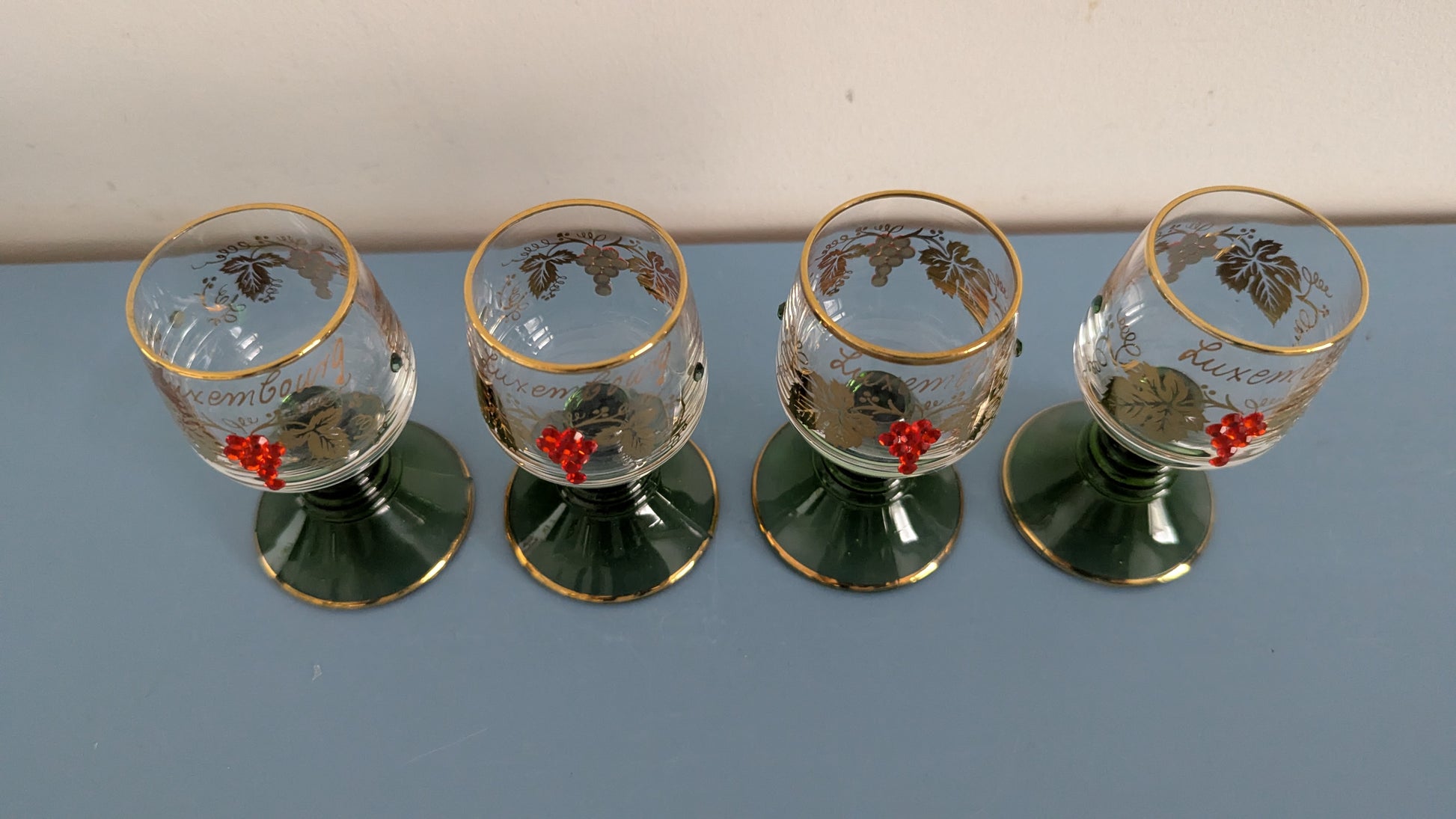 Lasin ympäri kierää kultainen lehti ja punainen kohokuvioitu rypäle kuviointi. Lisäksi laseissa kultainen Luxembourg teksti. Koristeet erinomaisessa kunnossa.