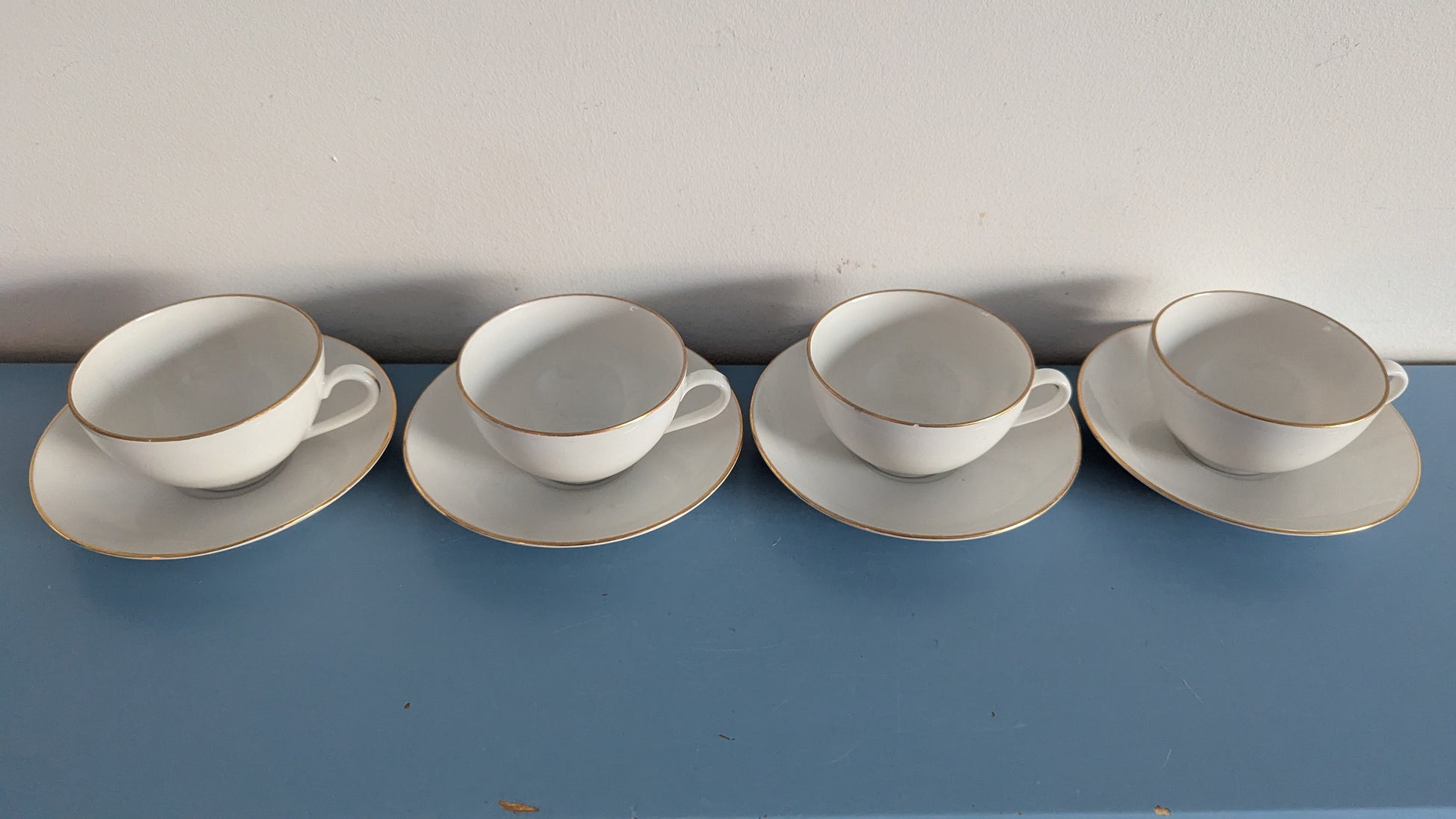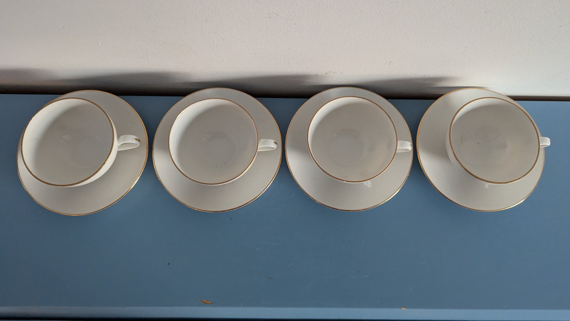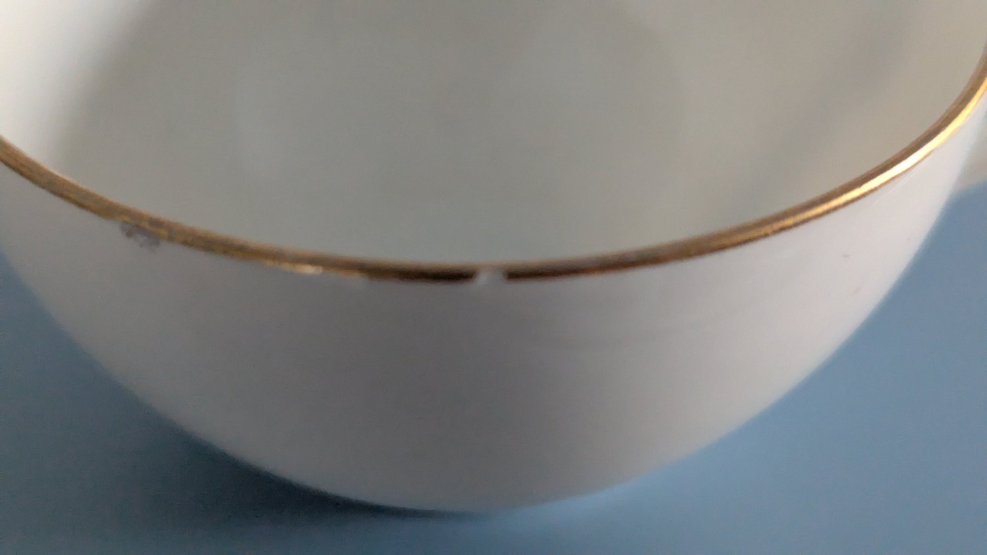Yhdessä kupissa viimeisen kuvan mukainen minimaalinen iskemä. Tuntuu kynnellä. Muissa ei iskemiä. Kultaukset erinomaisessa kunnossa. Ei halkeamia. Käyttökulumaa ei ole tai se on minimaalista.