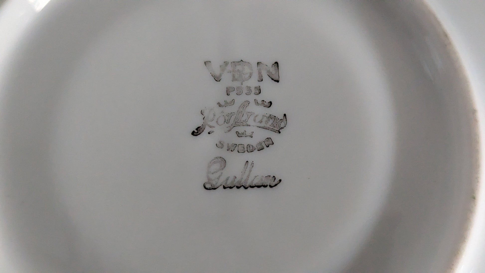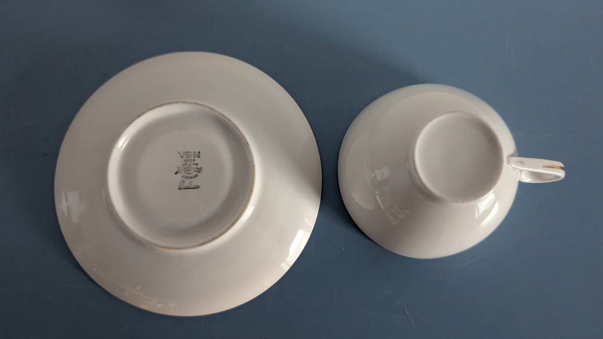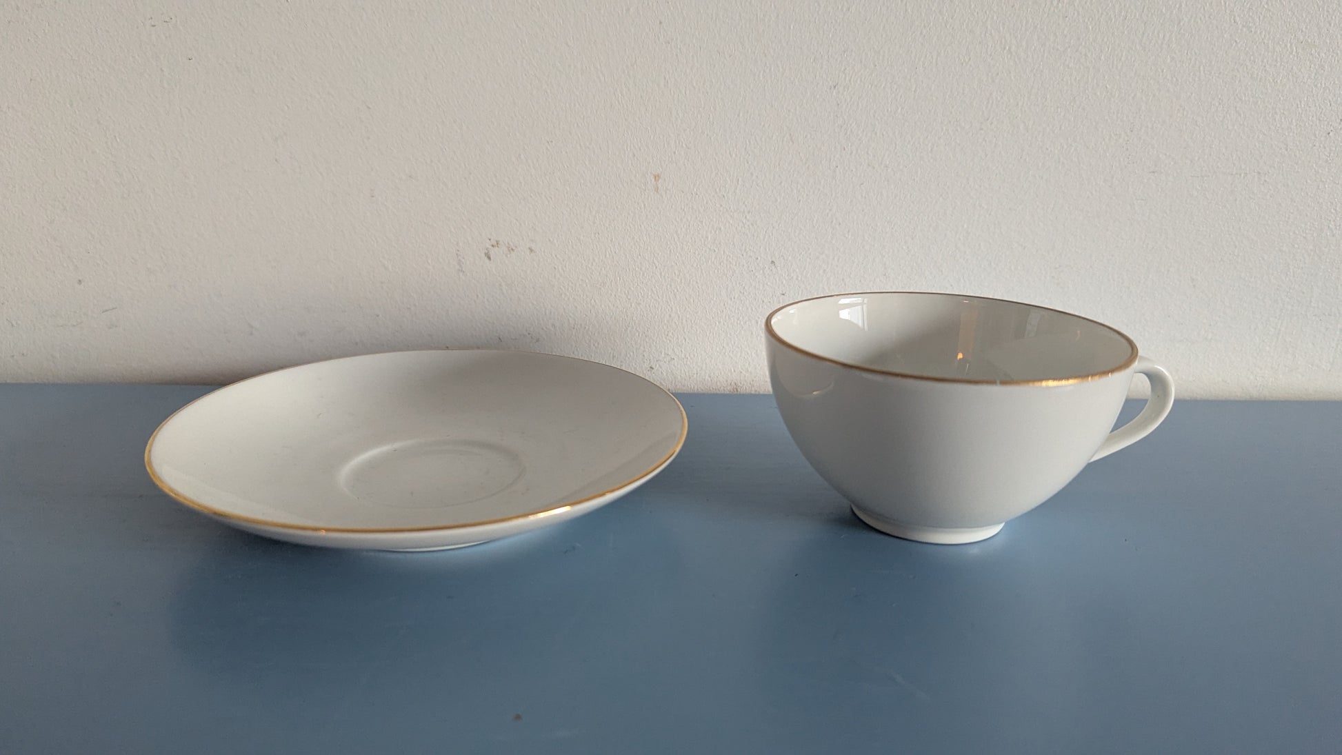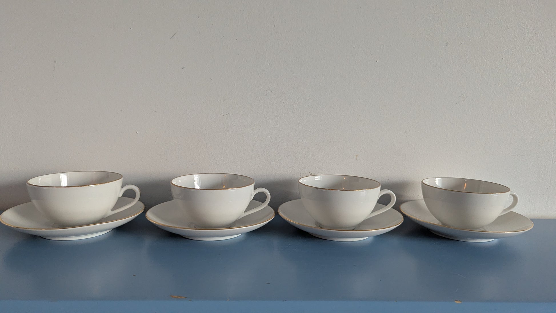 Yhdessä kupissa viimeisen kuvan mukainen minimaalinen iskemä. Tuntuu kynnellä. Muissa ei iskemiä. Kultaukset erinomaisessa kunnossa. Ei halkeamia. Käyttökulumaa ei ole tai se on minimaalista.