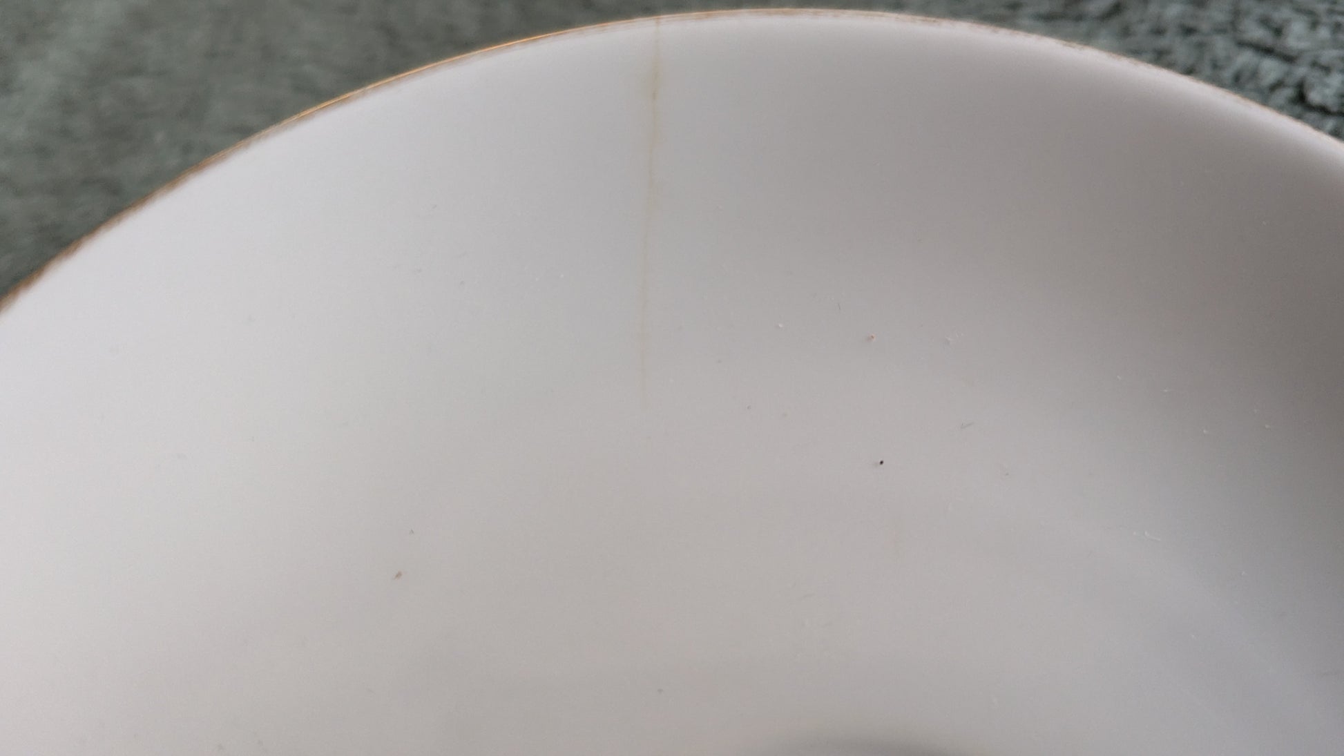 Ei iskemiä. Koriste ja kultaus kunnossa. Käyttökulumaa ei ole tai minimaalista. Toisessa lautasessa viimeisen kuvan mukainen 3cm halkeama. Toisessa ei halkeamia