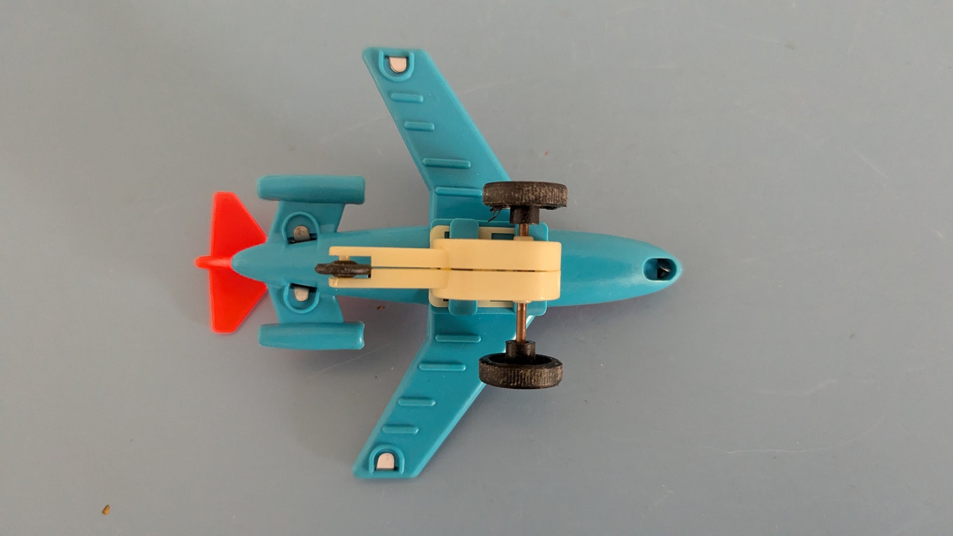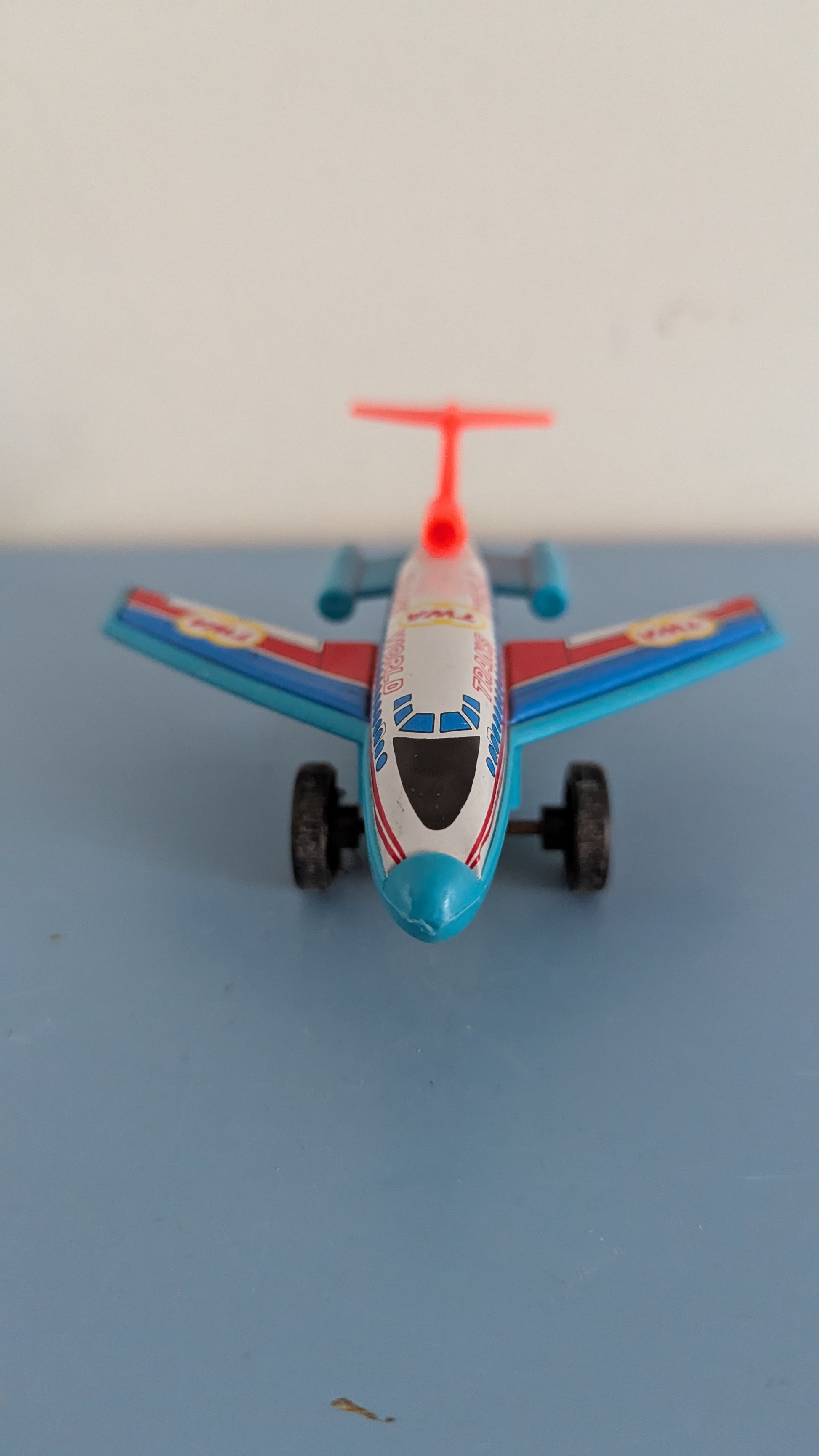 Boeing 727 koki ensilentonsa 1963 ja konetyypillä aloitettiin liikennöinti jo seuraavana vuonna. Tämä amerikkalaisen TWA:n (Trans World Airlines) logoissa oleva " peltilelu " valmistettu todennäköisesti 1960-luvulla. Siipien ja rungon yläosa metallia. Loput muovia eli oranssi ja sininen kohta sekä renkaat ja valkoinen osa pohjassa.