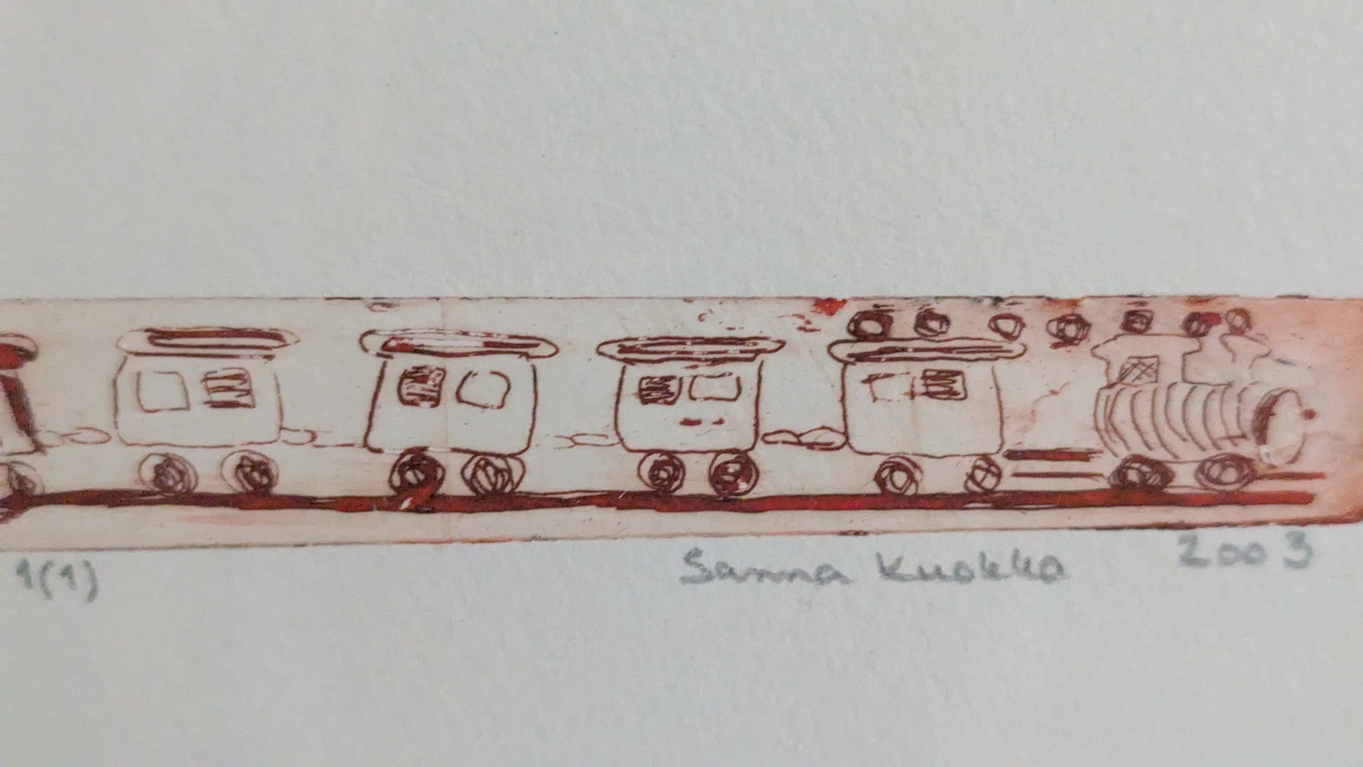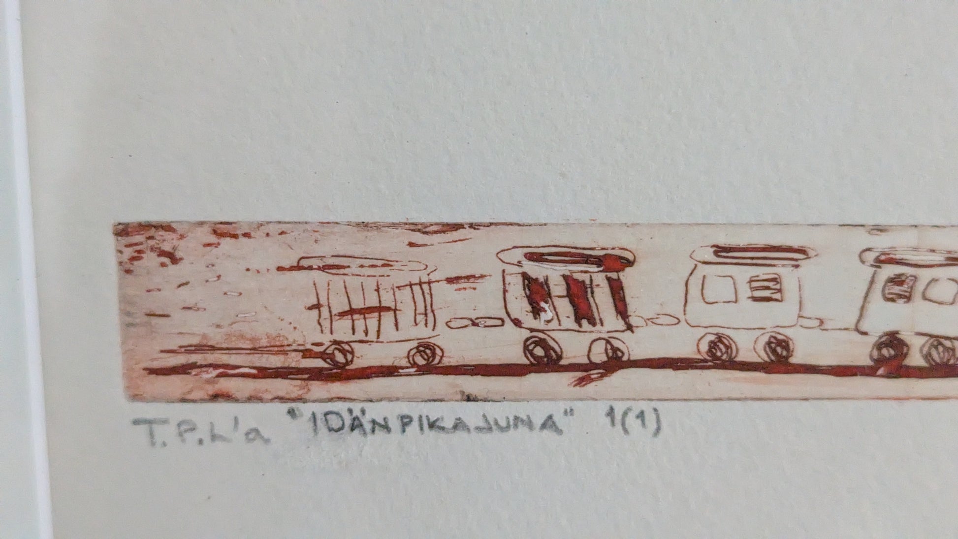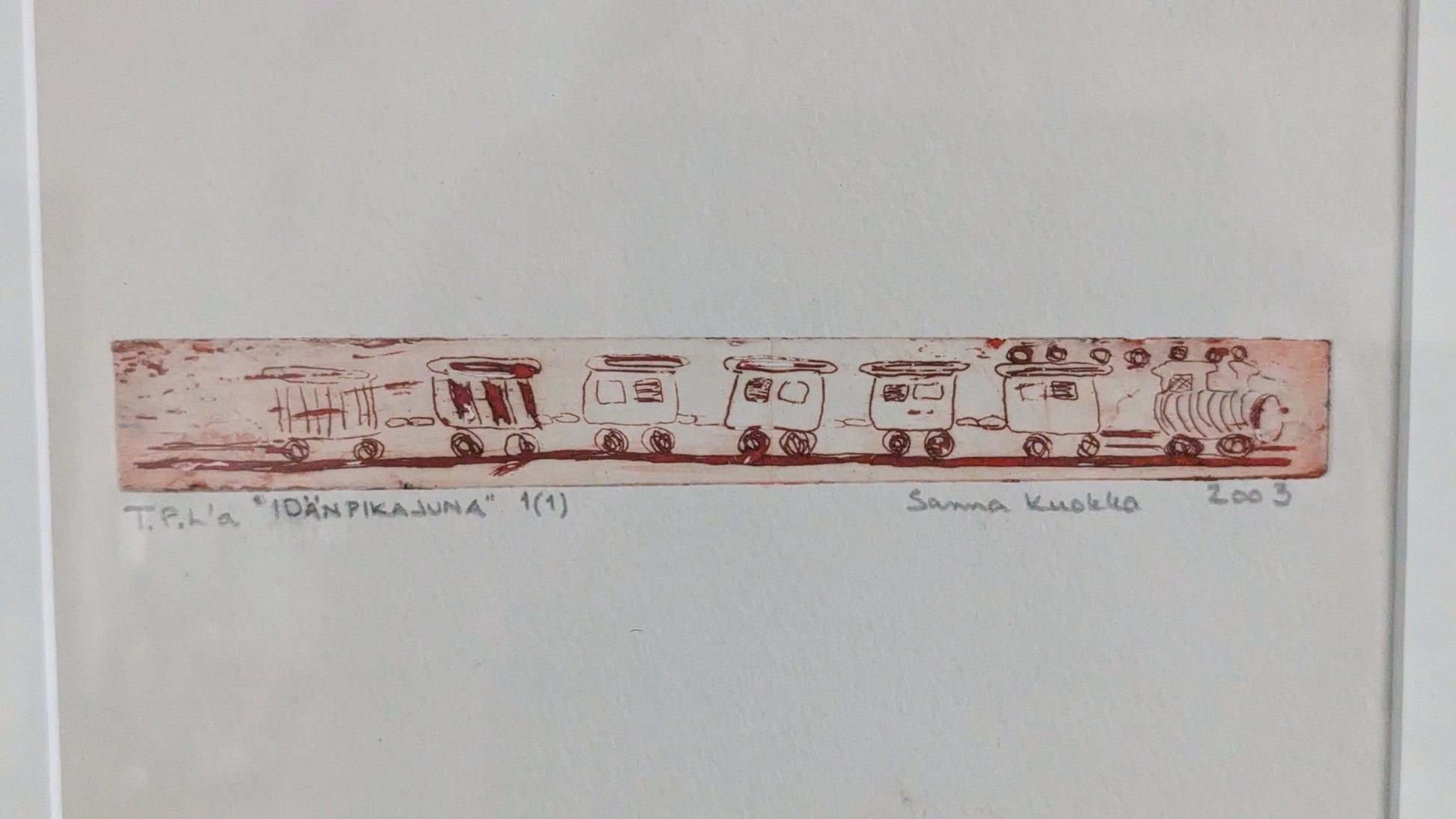 Marianne Kokkosen signeeraama Idänpikajuna niminen monotypia vuodelta 2003. Teos numeroitu 1/1 eli kyseessä uniikki työ.