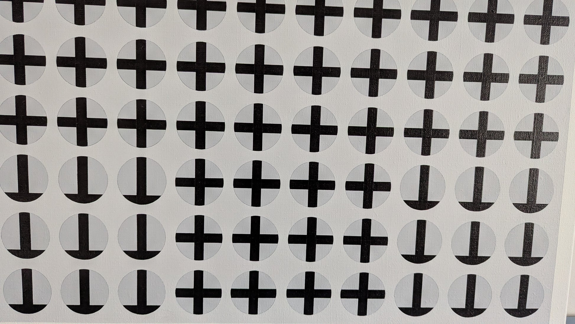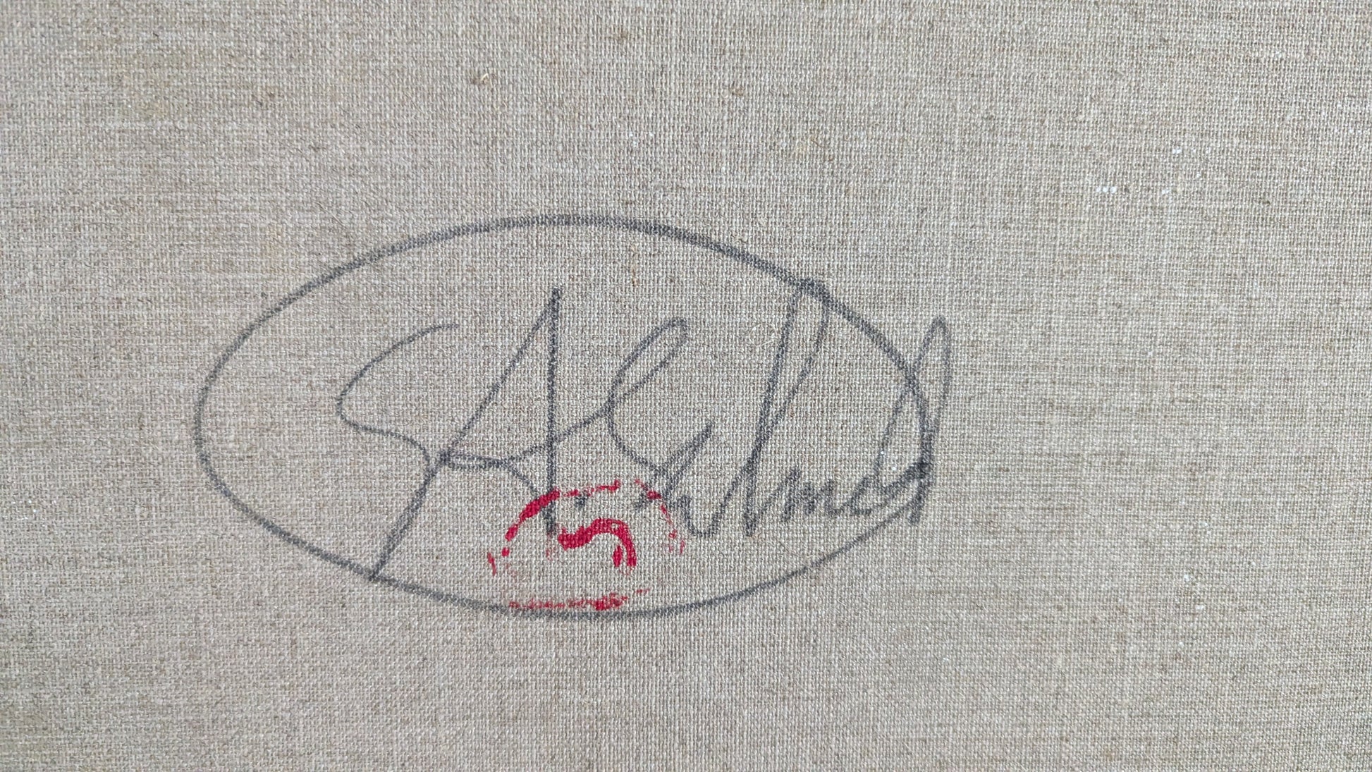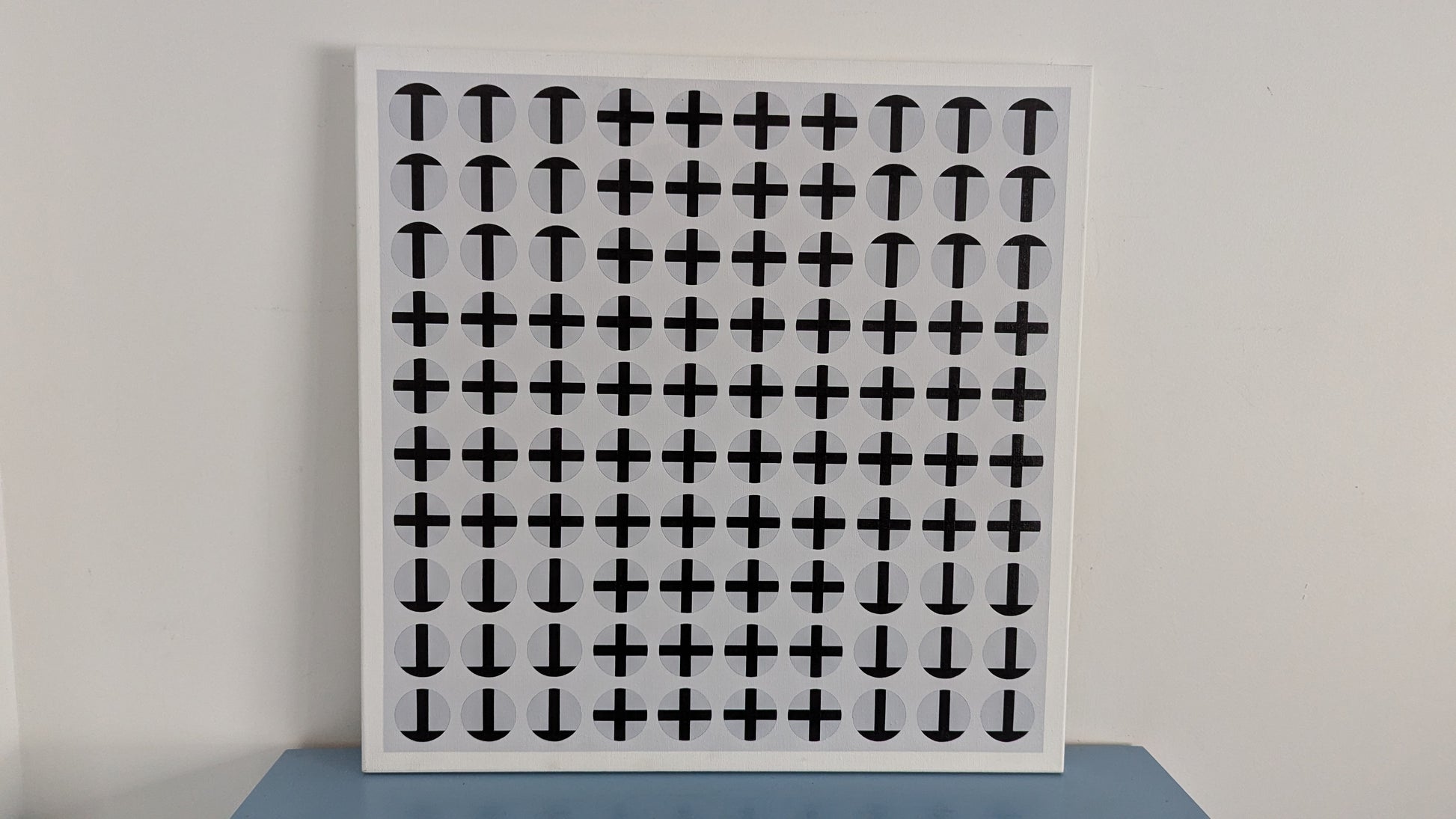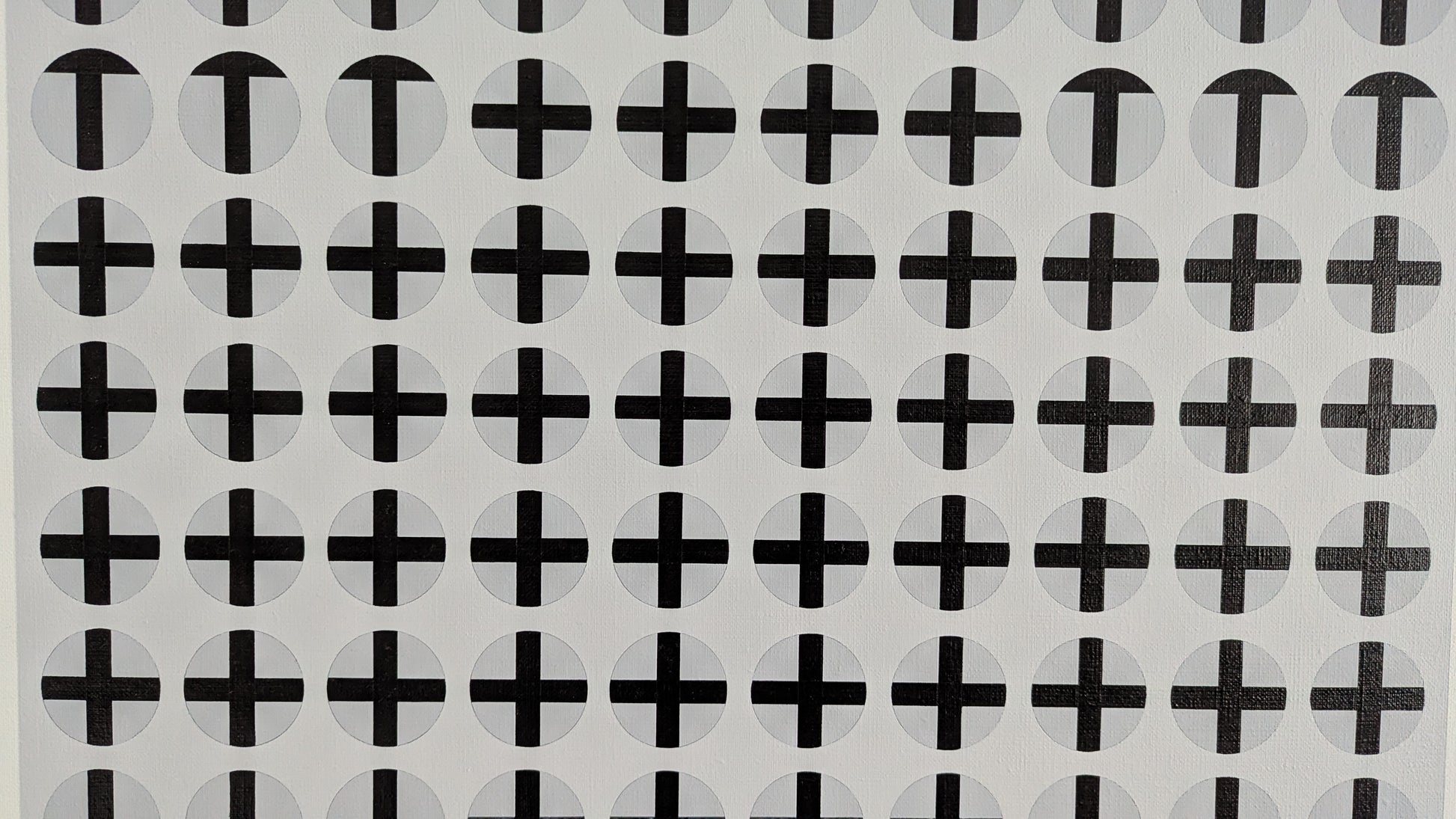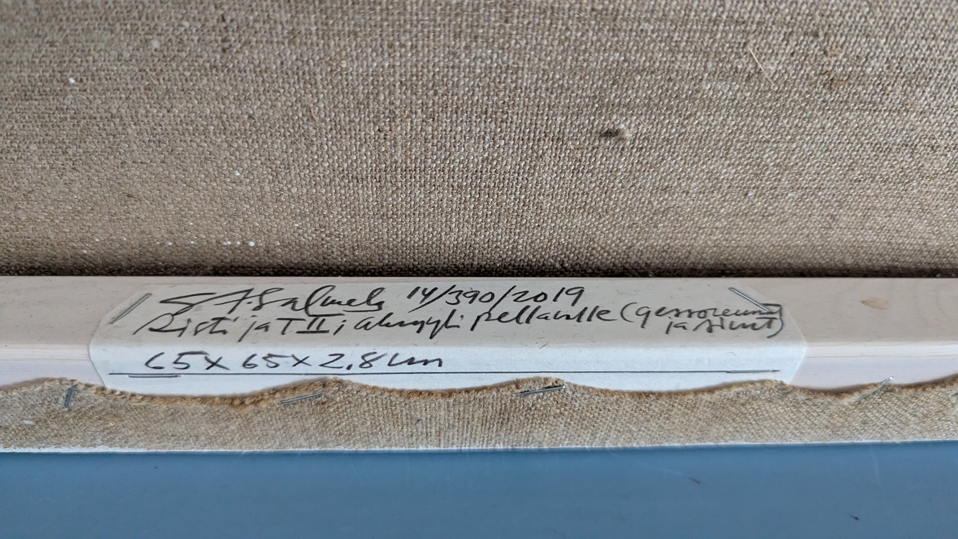 Seija Salmelan signeeraama Risti ja T II niminen akryylityö pellavalle vuodelta 2019.