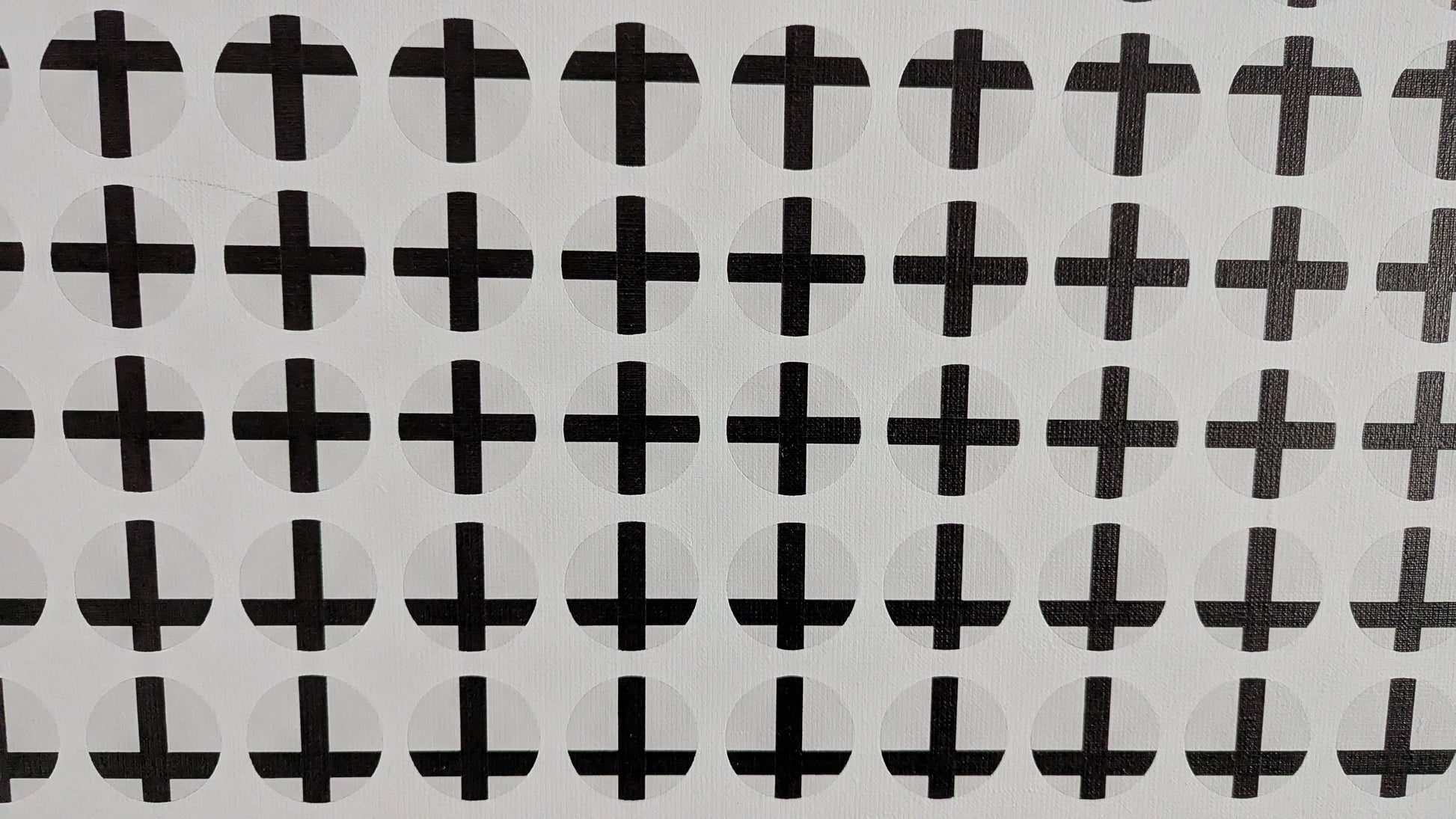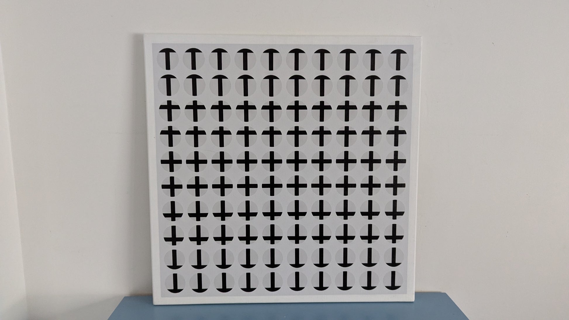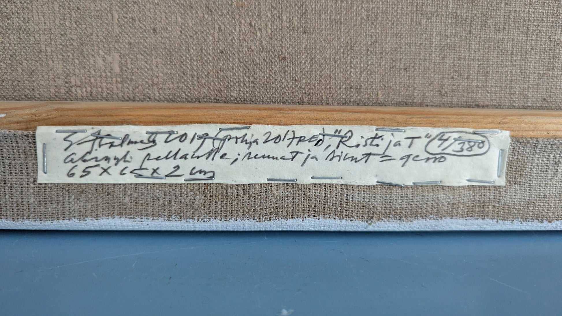Seija Salmelan signeeraama Risti ja T niminen akryylityö pellavalle vuodelta 2017.
