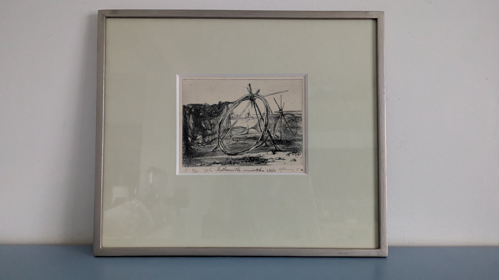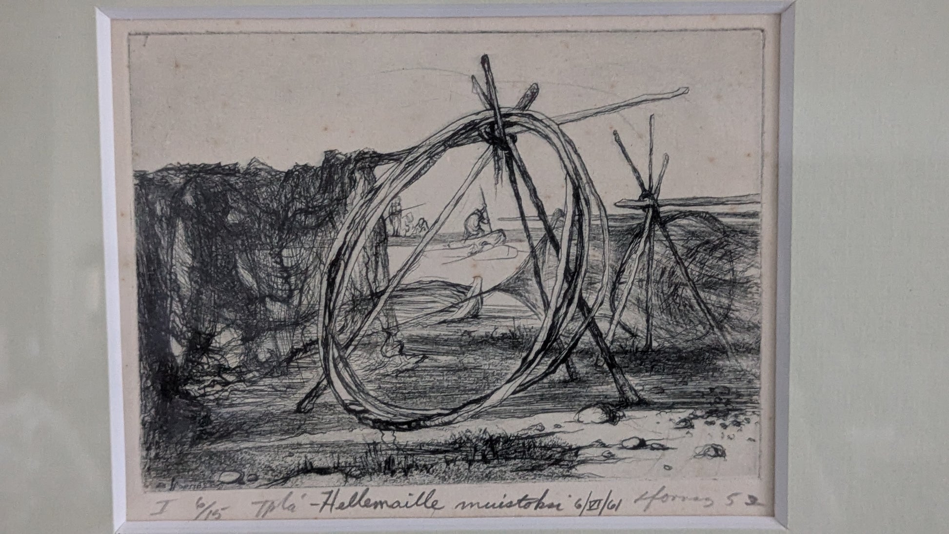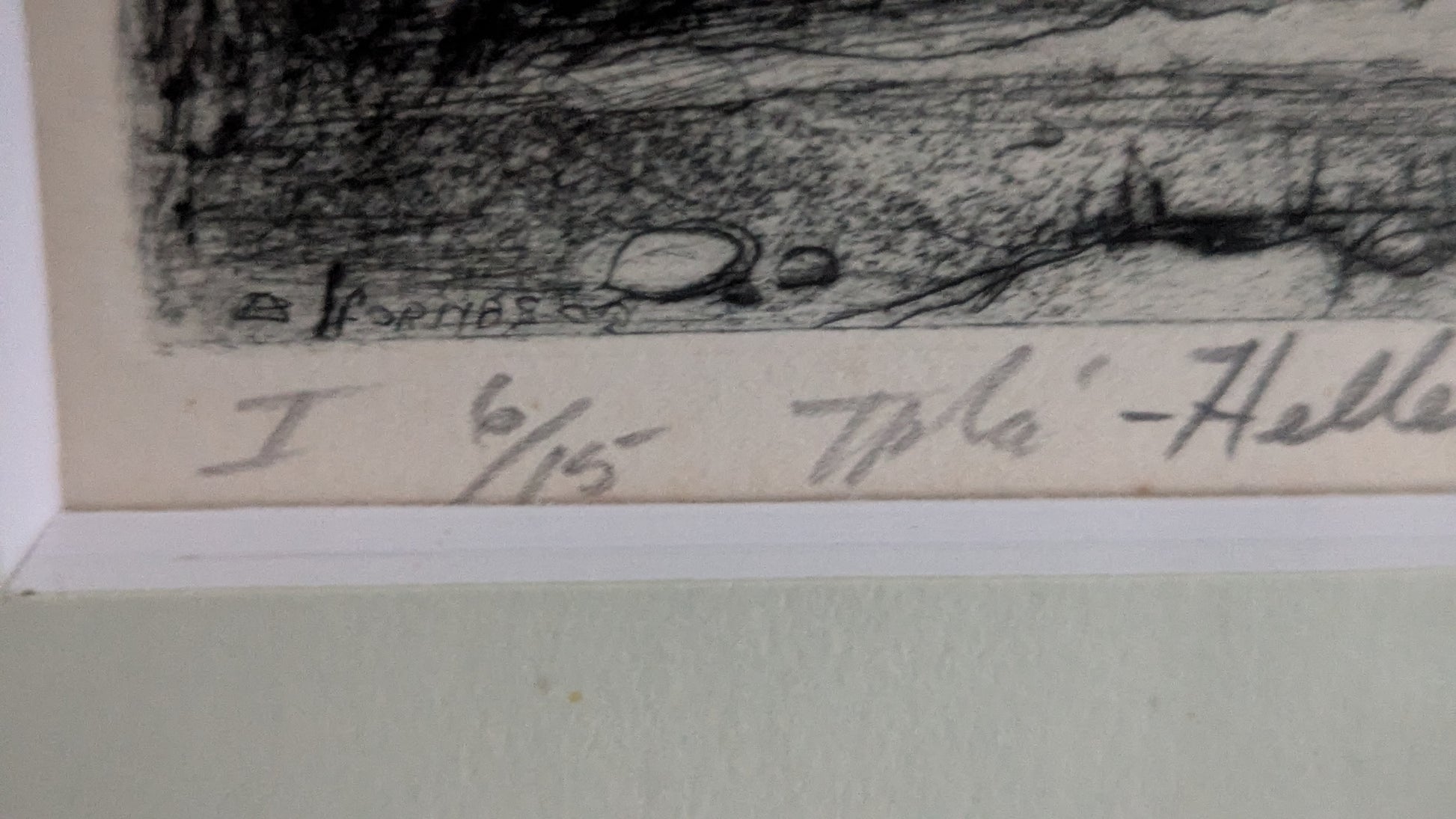 Teoksen alla vedosmerkintä Tpl'a eli kyseessä taiteilijan itsensä tekemä vedos. Lisäksi numerointi 6/15, taiteilijan signeeraus ja vuosiluku -52 sekä teksti Hellemaille muistoksi 6/XI/61.