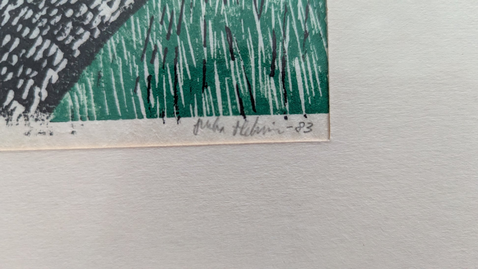 Signeerattu väripuupiirros vuodelta 1983. Olisiko signeeraus mahdollisesti Juha Helminen