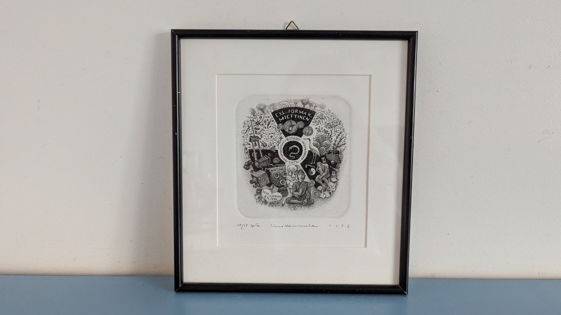 Simo Hannulaan signeeraama Jorma K. Miettinen Ex Libris vuodelta 1996