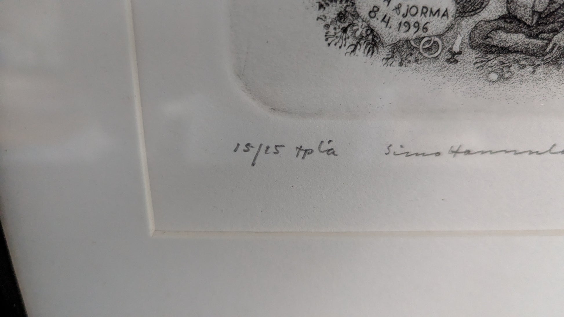 Teoksen alla merkintä tpl'a eli kyseessä taiteilijan itsensä tekemä vedos. Lisäksi numerointi 15/15 sekä taiteilijan signeeraus ja vuosiluku 1996.
