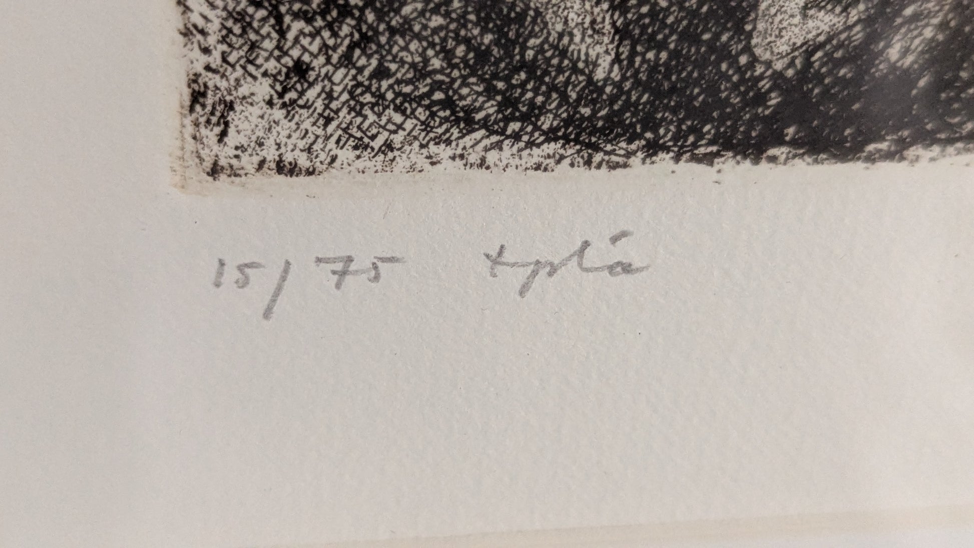 Teoksen alla merkintä tpl'a eli kyseessä taiteilijan itsensä tekemä vedos. Lisäksi numerointi 15/75, teoksen nimi sekä taiteilijan signeeraus ja vuosiluku 1985.