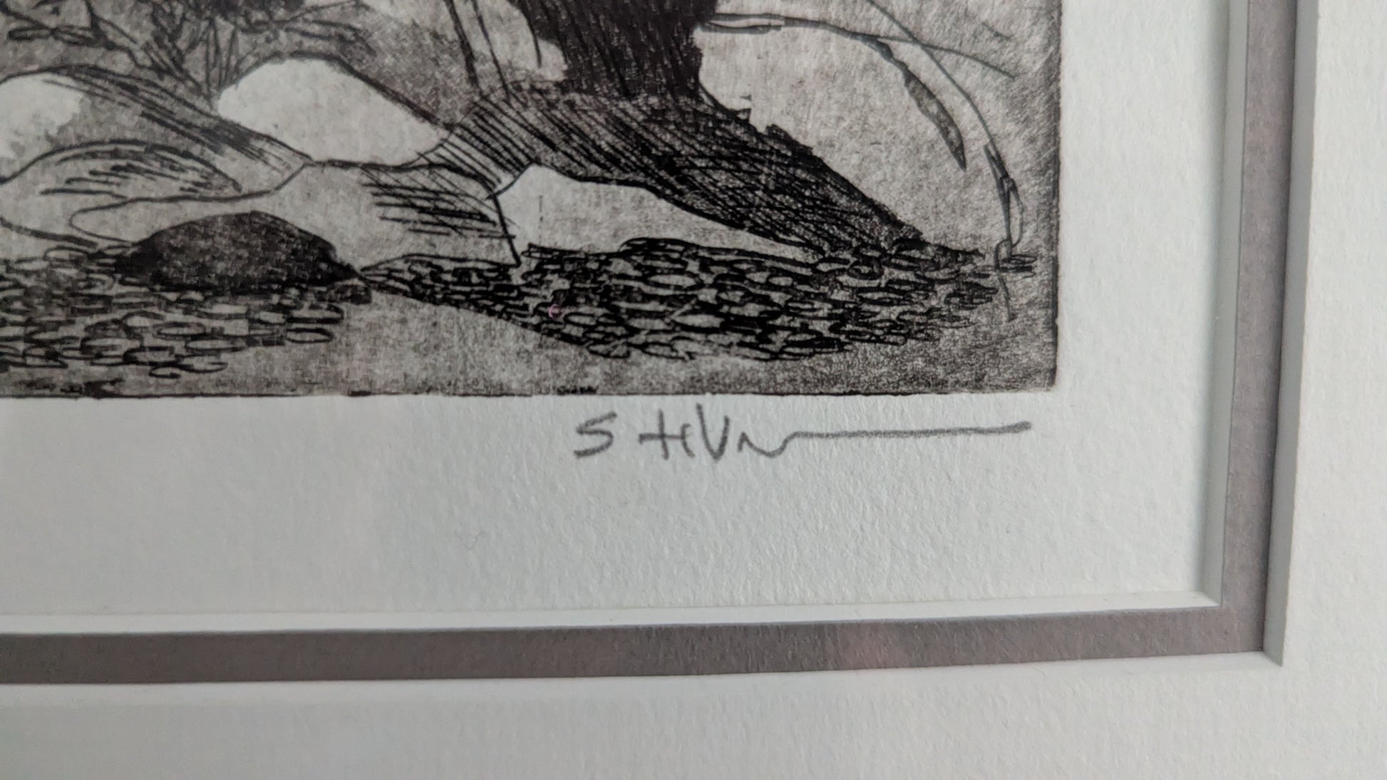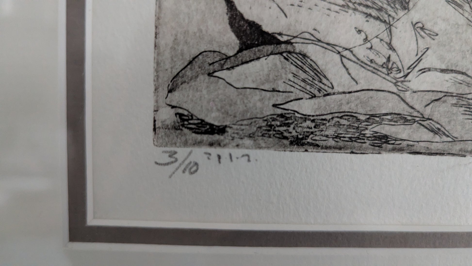 Teoksen alla merkintä tpl'a eli kyseessä taiteilijan itsensä tekemä vedos. Lisäksi numerointi 3/10, teoksen nimi sekä taiteilijan signeeraus.