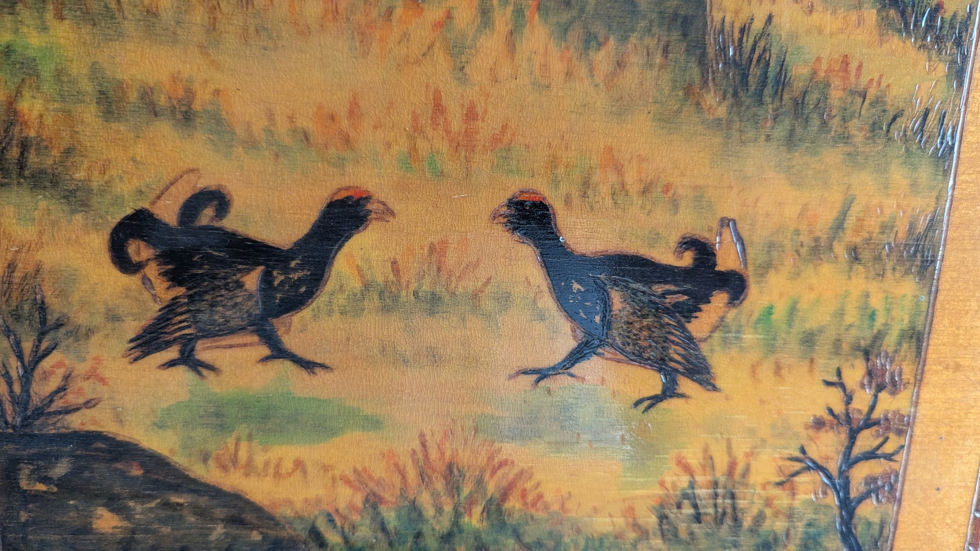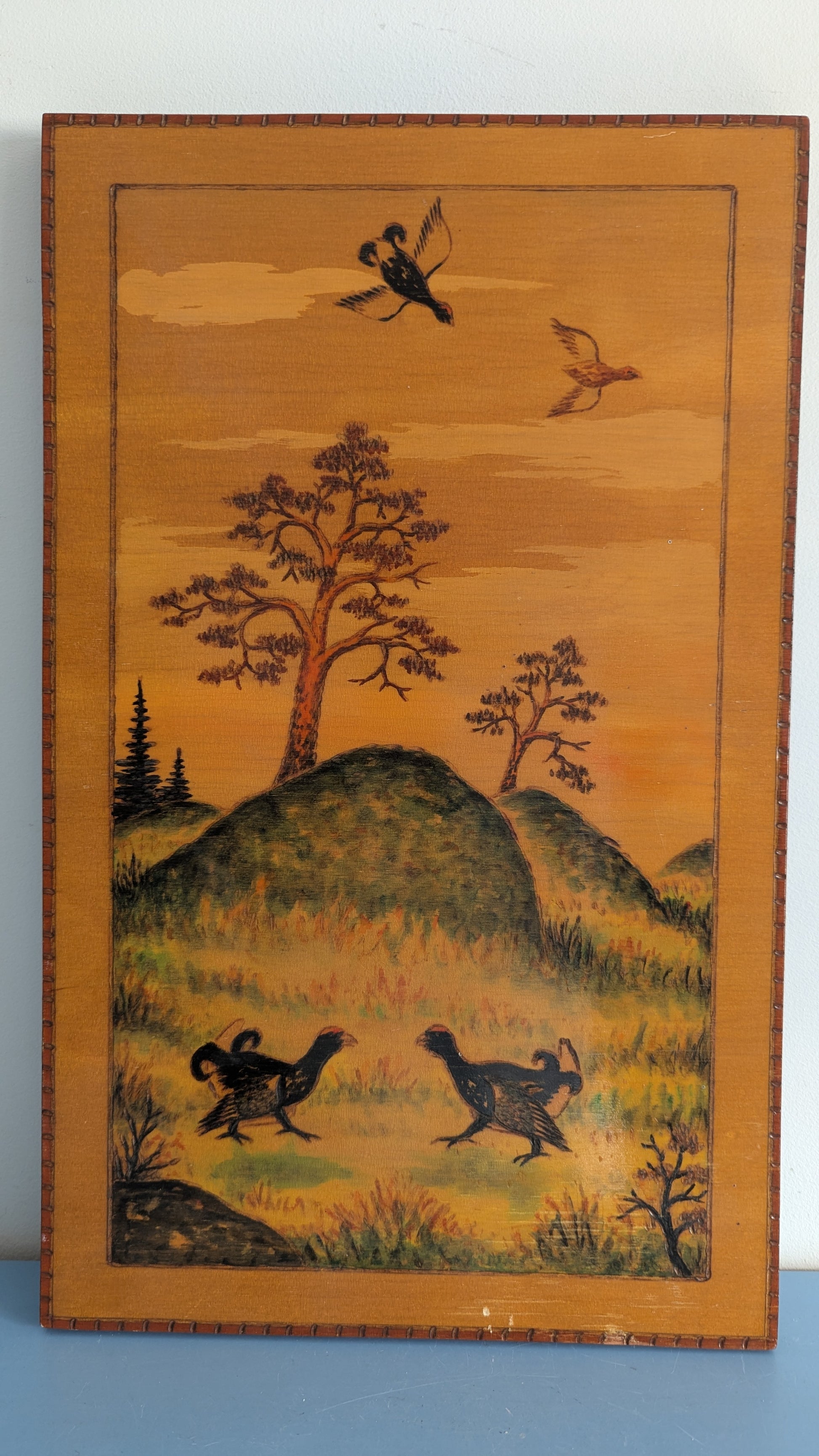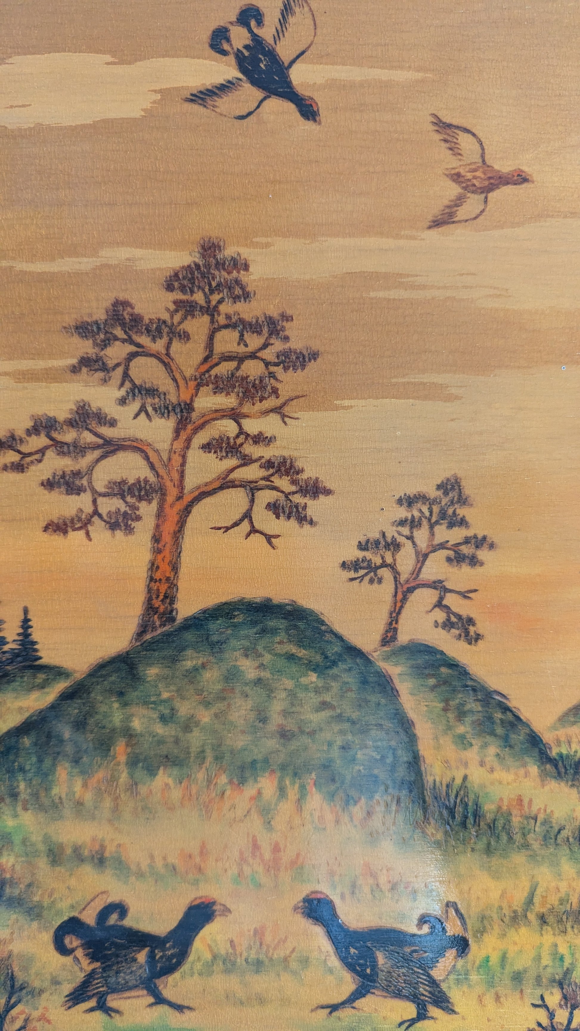 Sven Edwin Ritvallin signeeraama Orrlek niminen eli teerien soidinta kuvaava sekatekniikkatyö (Pyrografia / Akvarelli). Työ tehty sekä polttokynällä että vesiväreillä ja lopuksi lakattu. Teos kokonaan puuta.