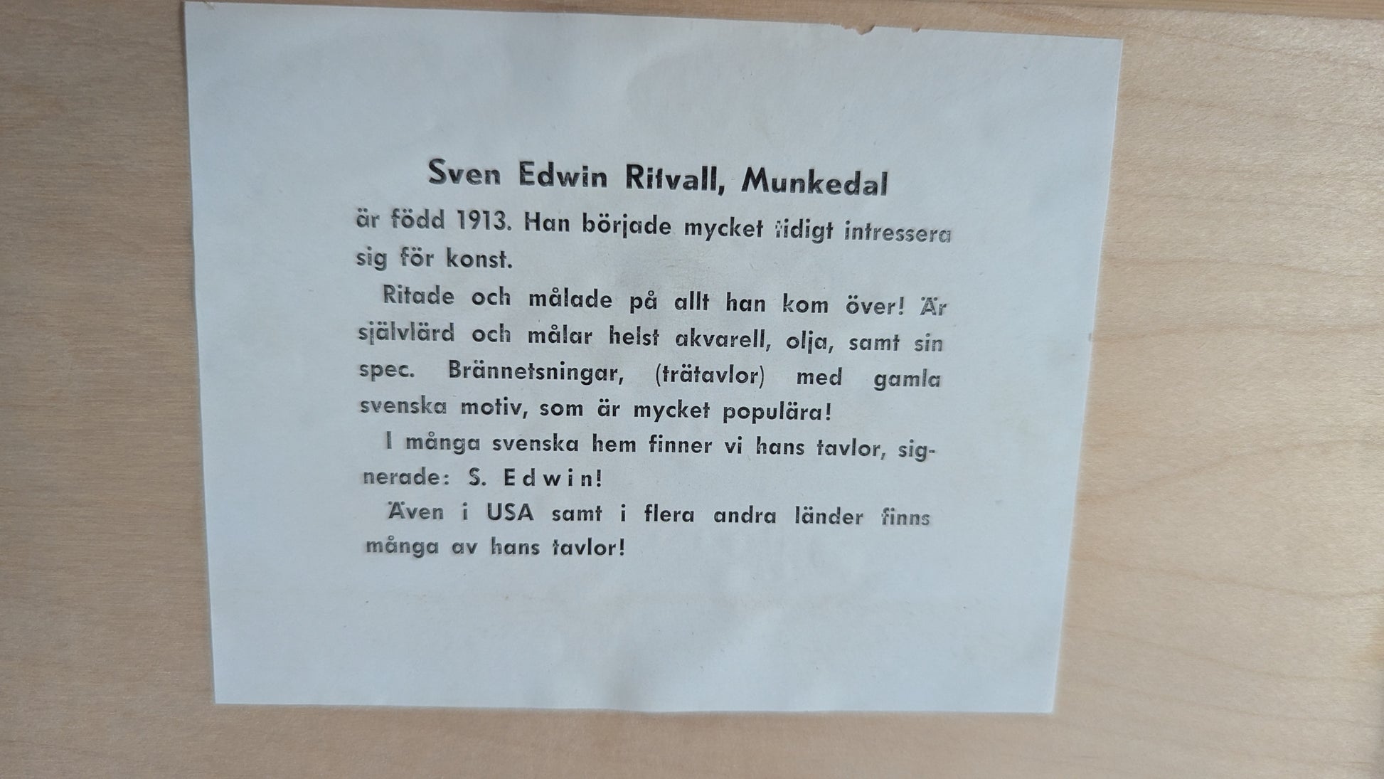 Teoksen takana signeeraus ja teoksen nimi sekä infoa taiteilijasta.
