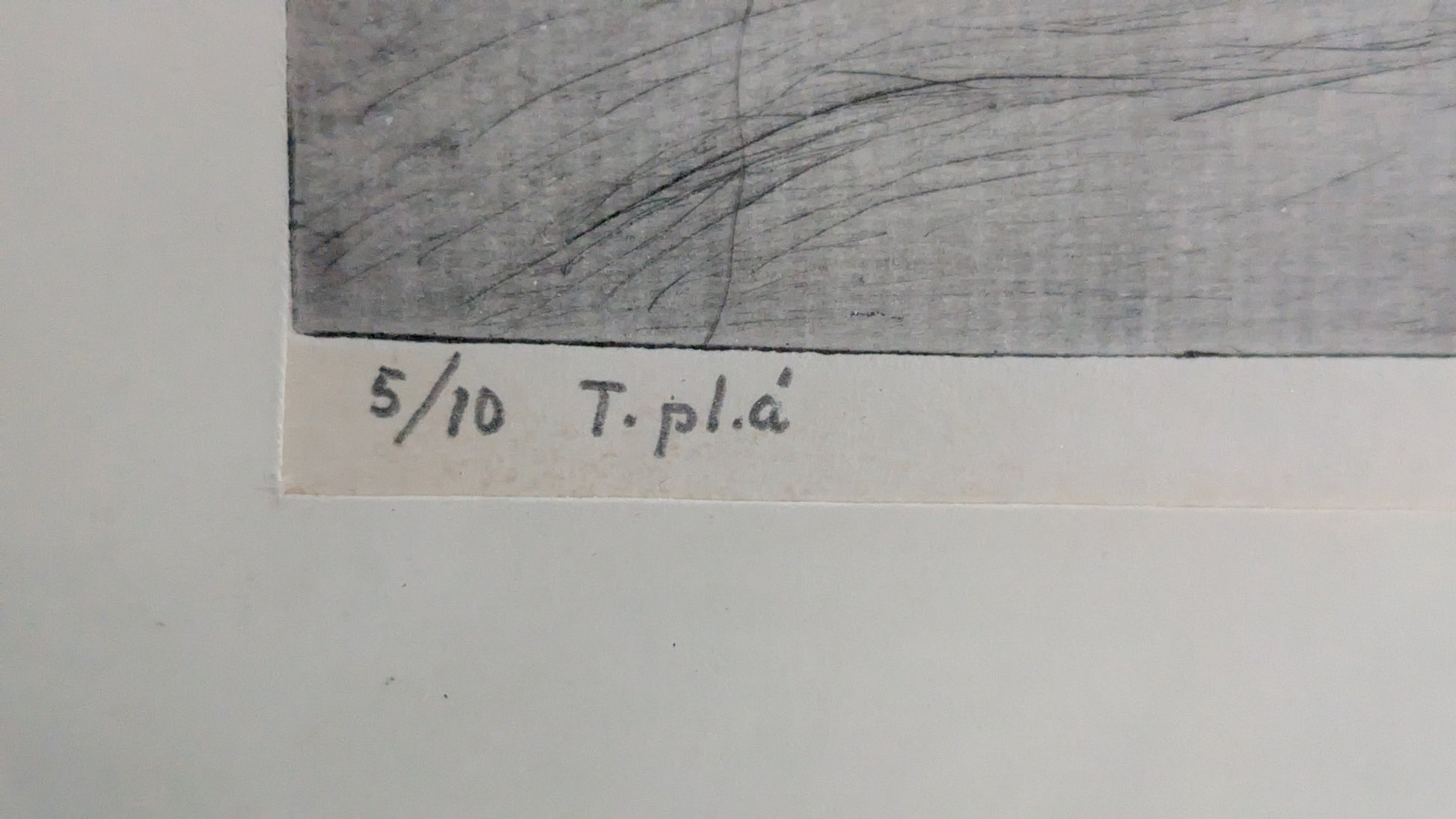 Teoksen alla merkintä tpl'a eli kyseessä taiteilijan itsensä tekemä vedos. Lisäksi numerointi 5/10 sekä taiteilijan signeeraus.
