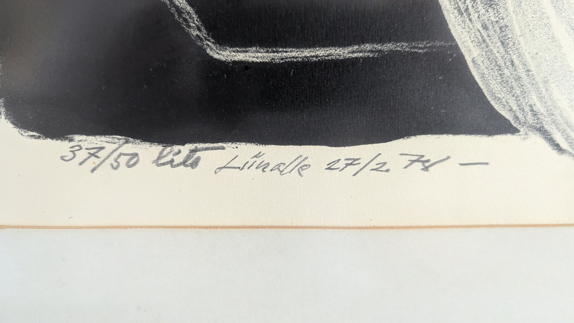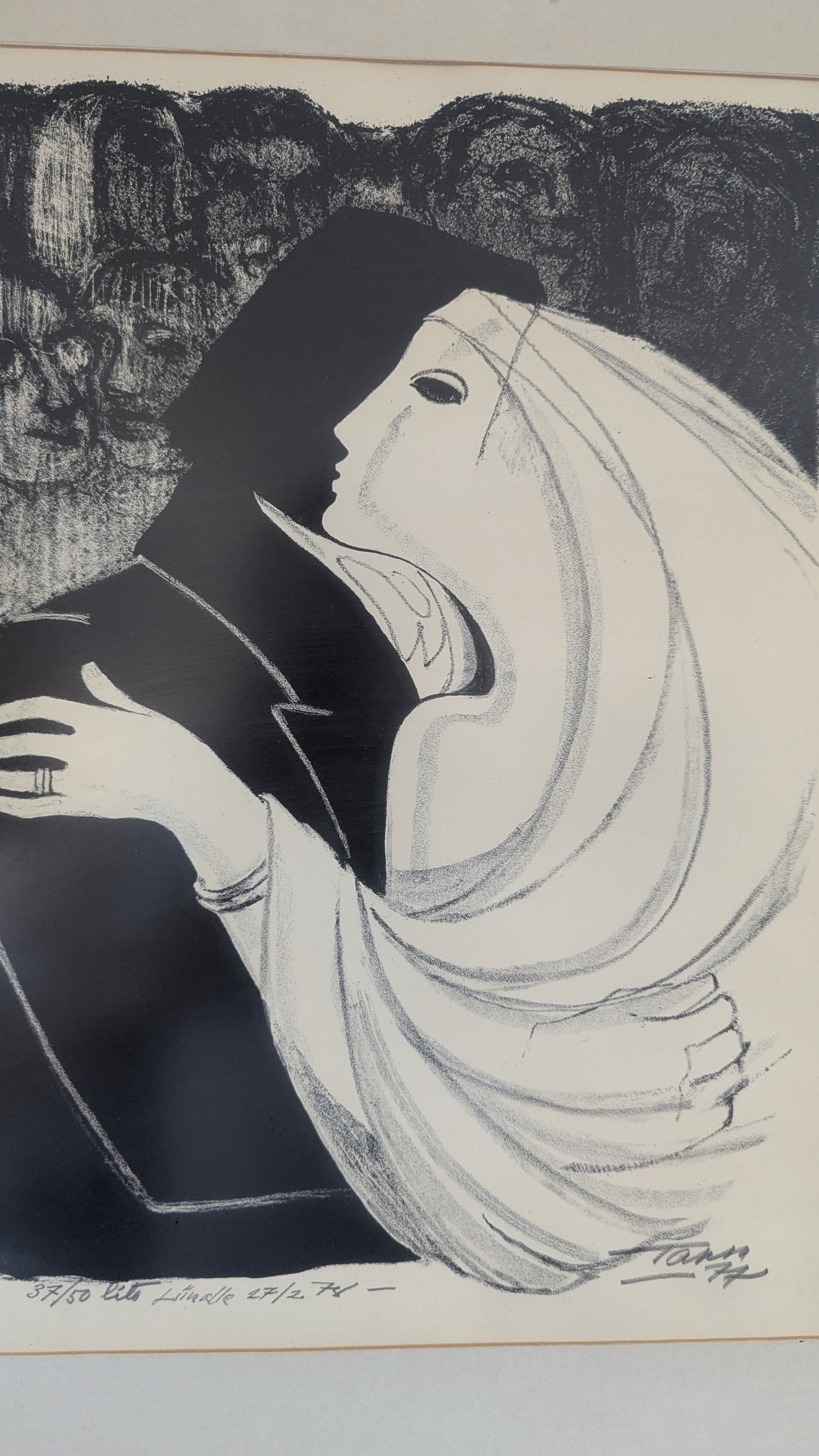 Teoksen alla numerointi 37/50, teksti lito, taiteilijan signeeraus, ja vuosiluku -77. Lisäksi teoksen alla omistuskirjoitus Liinalle 27/2 -78.