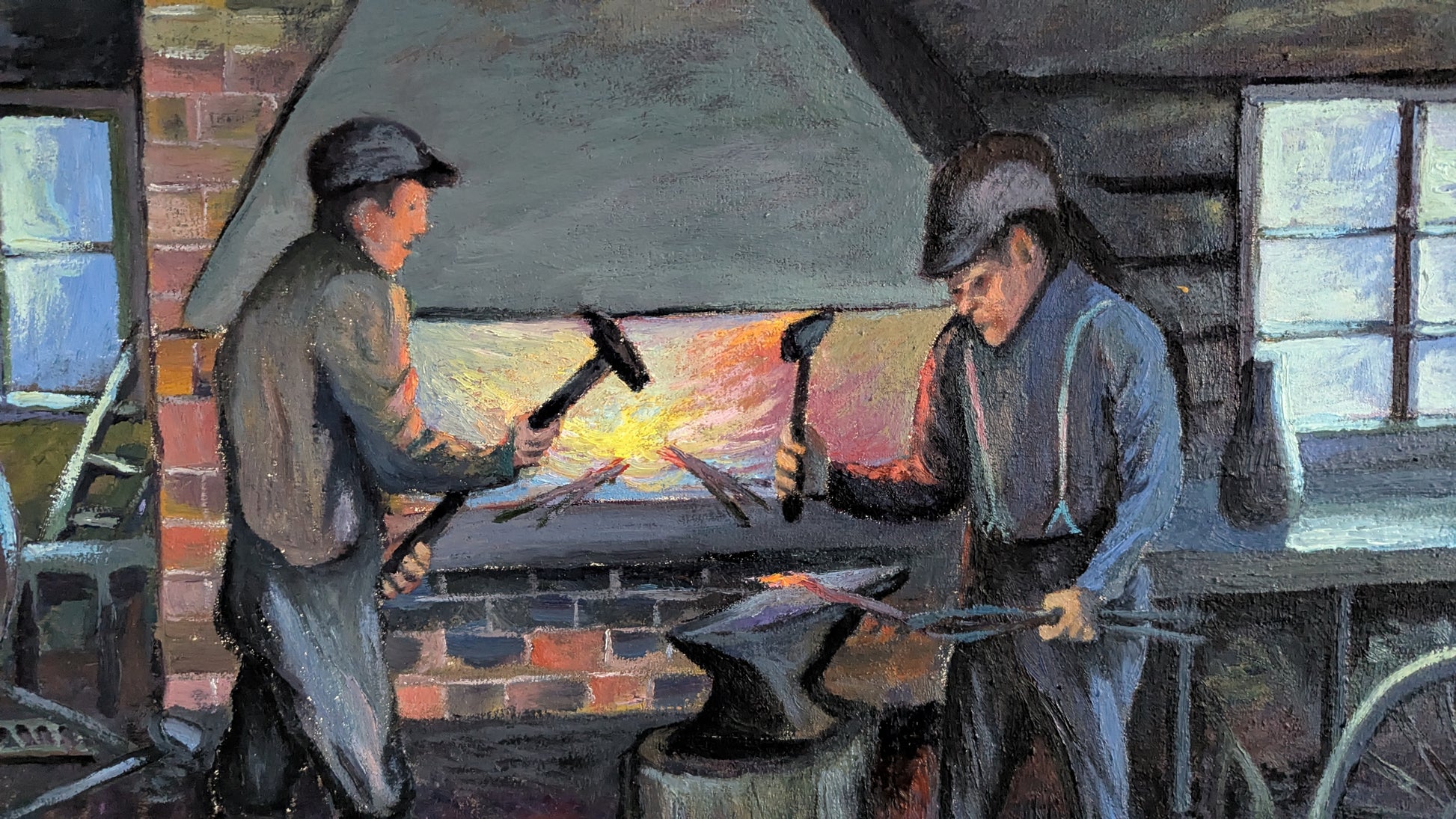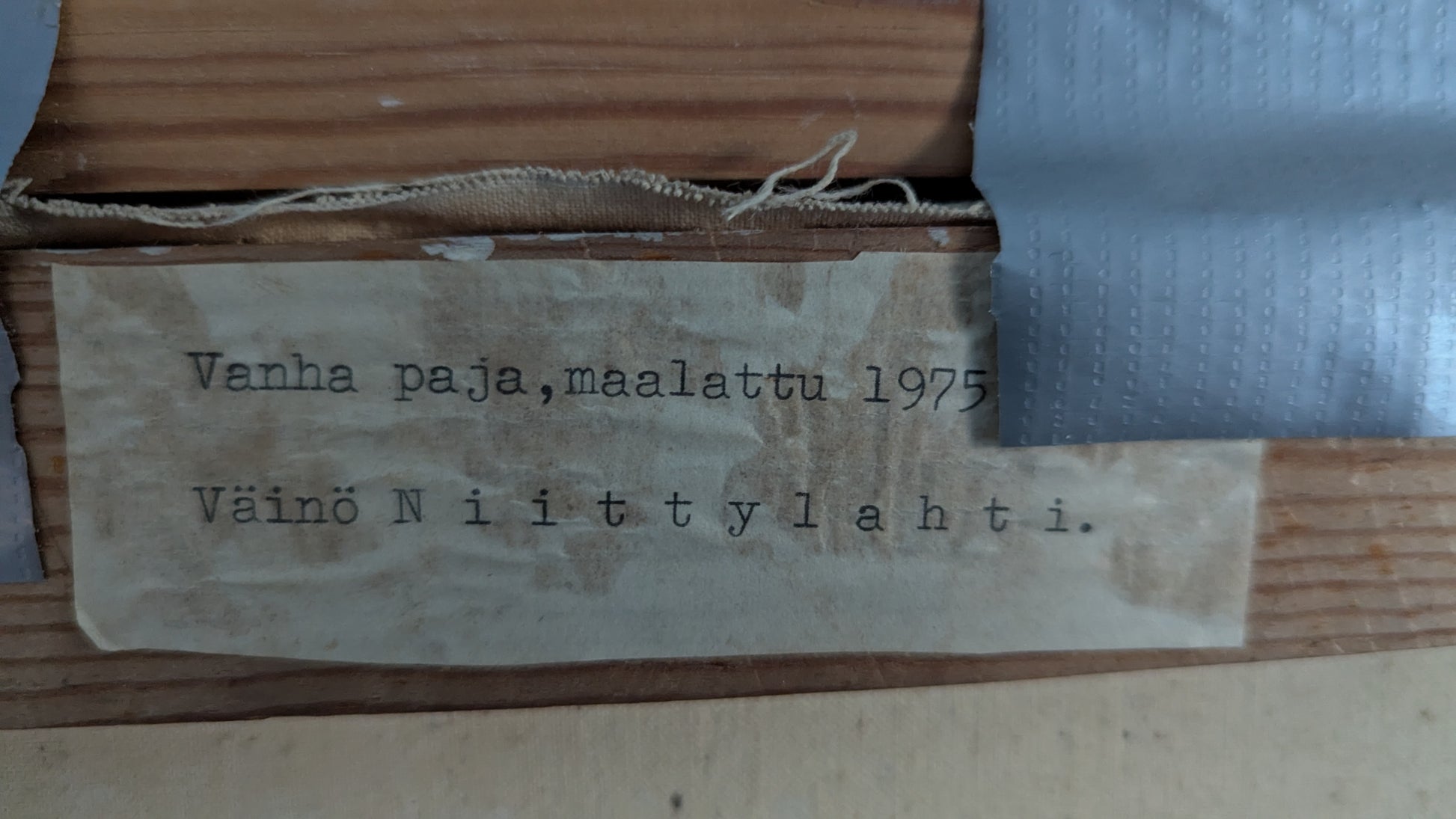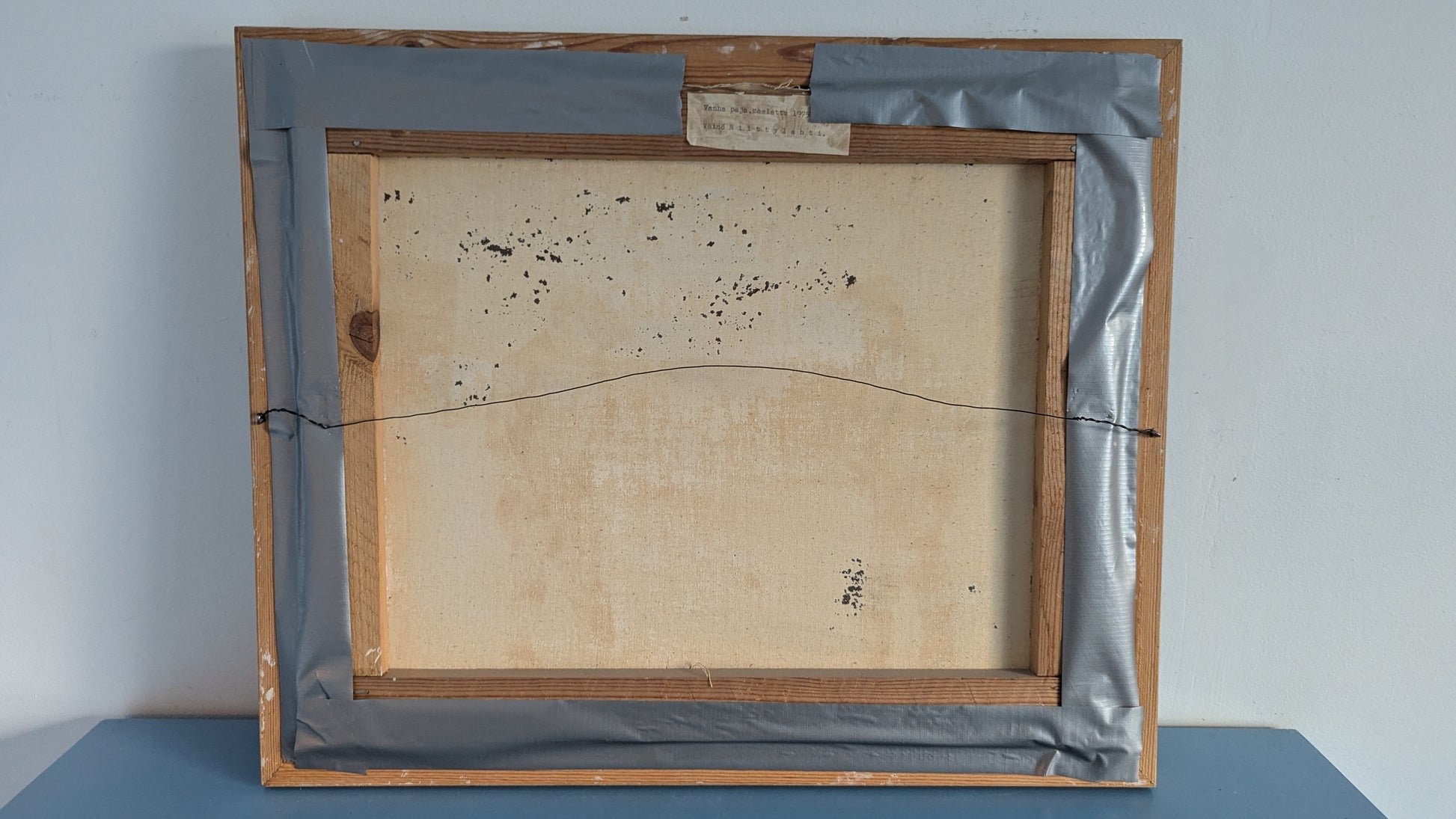 Kehyksen kiinnityksessä korjaustarve. Teos kiinni kehyksissä ilmastointiteipillä.