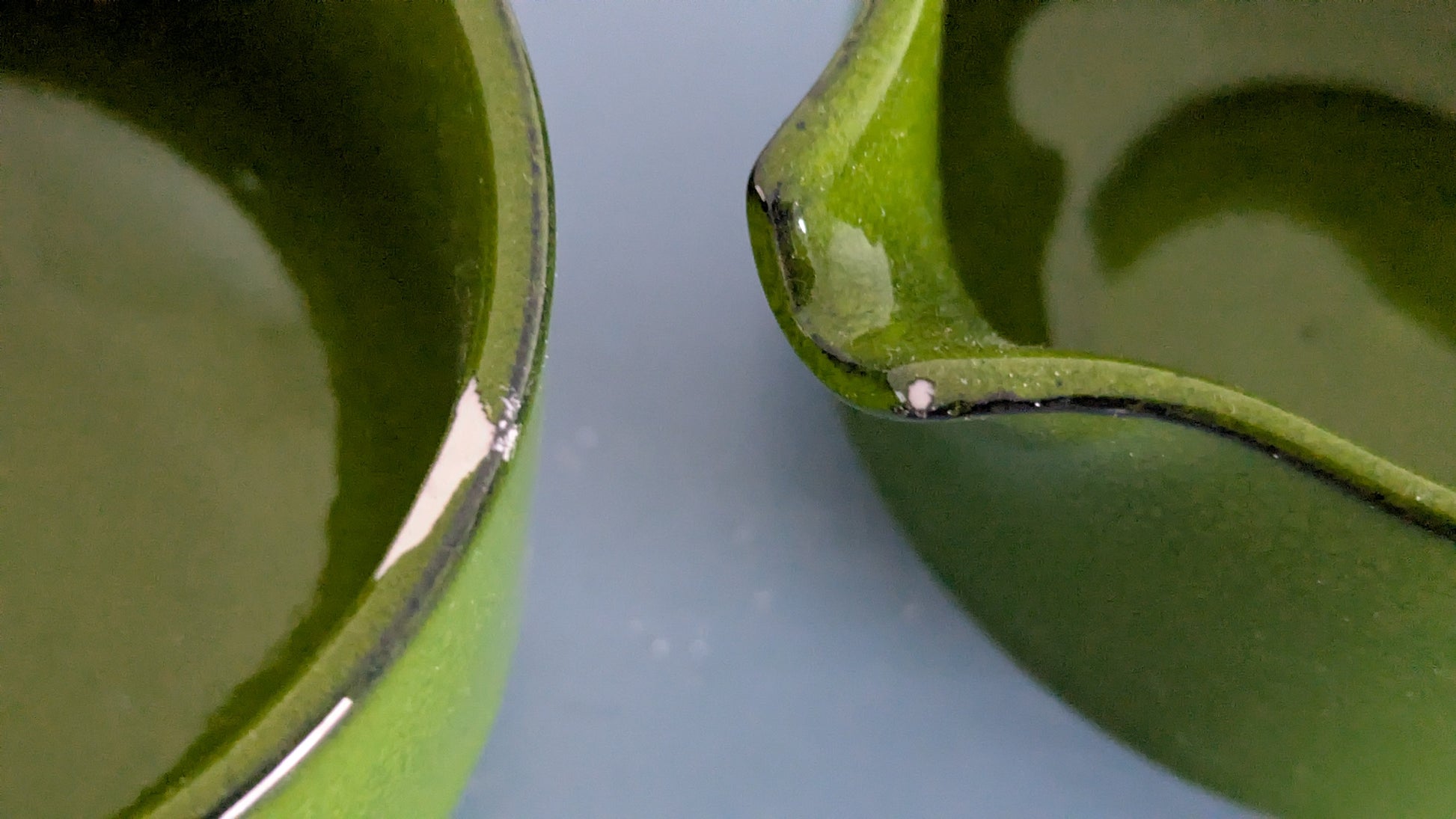Ei halkeamia. Kermakon suussa hieman alle 1mm iskemä. Sokerikon reunassa 1cm iskemä. Viat näkyy viimeisessä kuvassa. Lautasessa ei iskemiä. Sokerikon ja kermakon pohjassa vielä tarrat paikalla. Lautasessa hieman käyttökulumaa. Kermakossa ja sokerikossa ei siitä jälkiä.